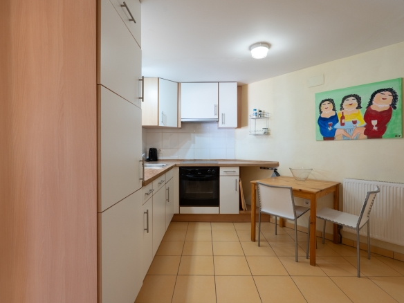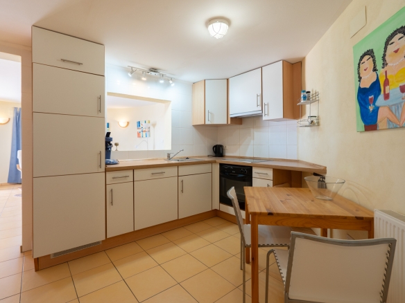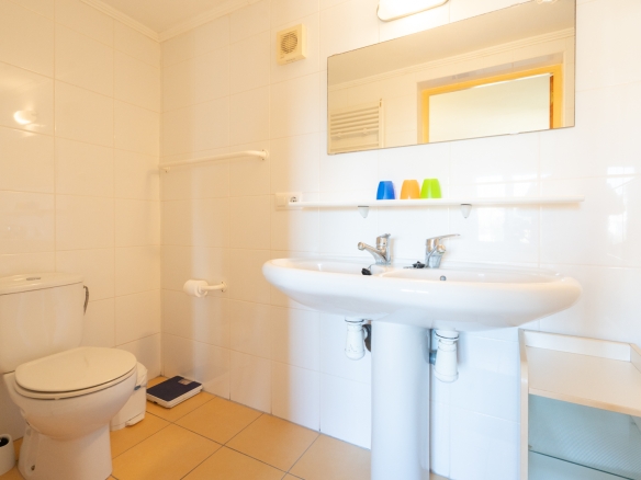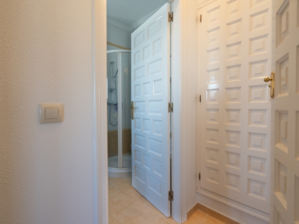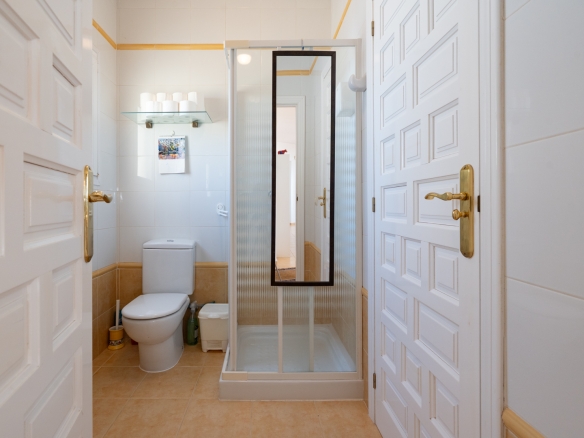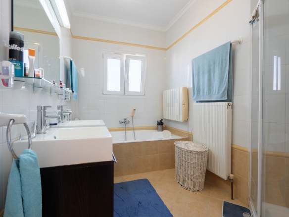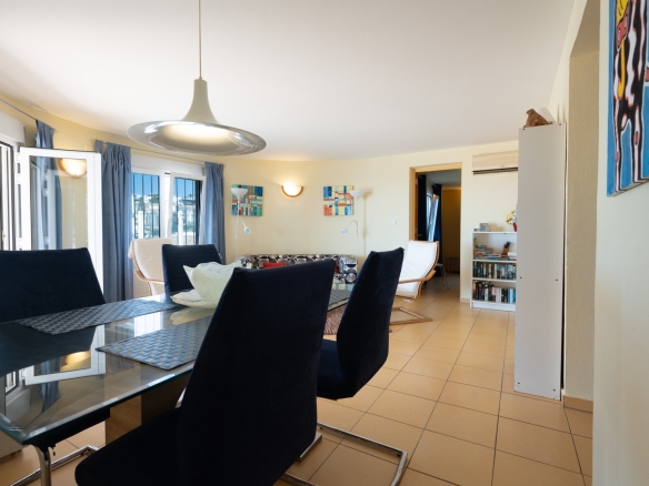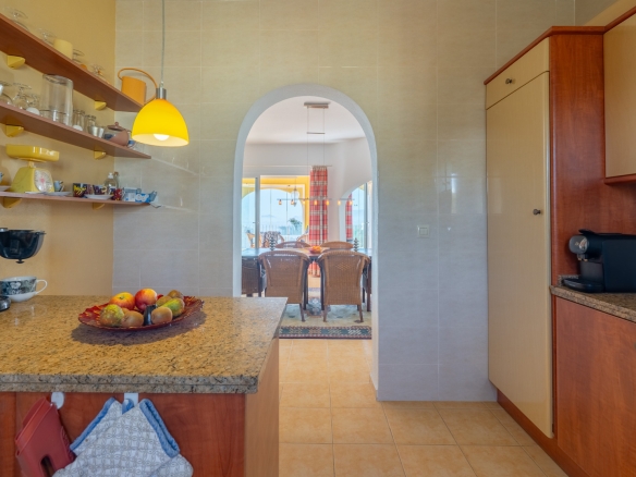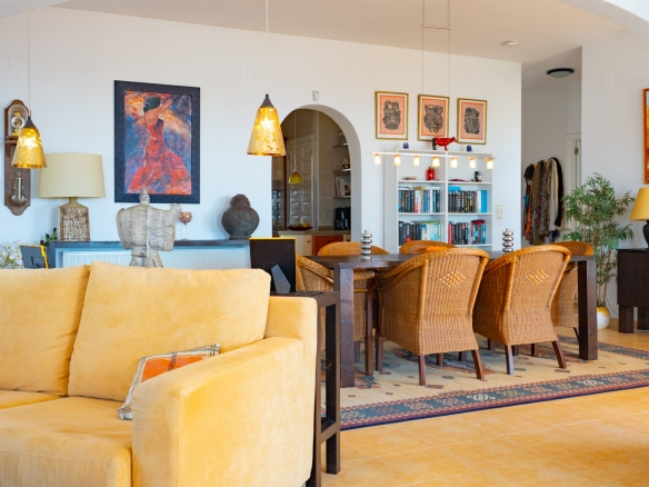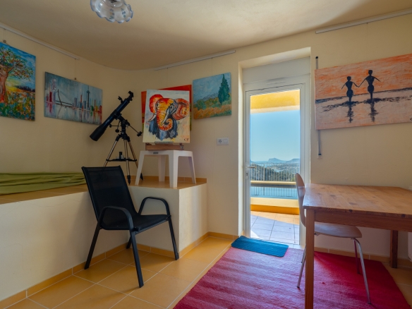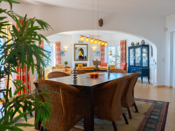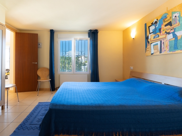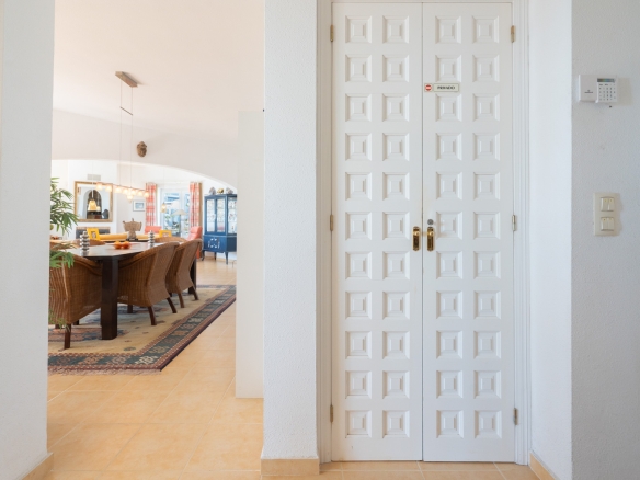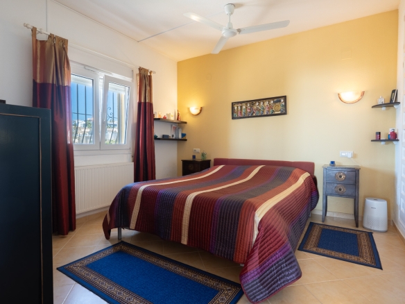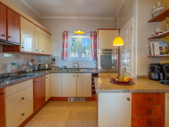 Der Hauptwohnbereich befindet sich im Obergeschoss und besteht aus einem großzügigen Wohn- und Esszimmer mit Kamin, einer geräumigen Küche mit Hauswirtschaftsraum, einem Schlafzimmer mit en-suite Badezimmer, einem Büro sowie einem zweiten Badezimmer. Angrenzend an das Wohnzimmer befindet sich eine Naya mit Zugang zu einer großzügigen Sonnenterrasse. Vom Büro aus führt eine Treppe in das Untergeschoss, wo sich auch ein Abstellraum befindet. Darüber hinaus gibt es auf dieser Ebene ein geräumiges Gästeapartment mit separatem Eingang, bestehend aus Wohn- und Esszimmer, Küche, Hauswirtschaftsraum, zwei Doppelschlafzimmern und zwei Badezimmern. Auf dieser Etage befindet sich auch der Pool, umgeben von einer großen, teilweise überdachten Terrasse. Die Villa ist mit Zentralheizung über Radiatoren und Klimaanlage warm/kalt ausgestattet.