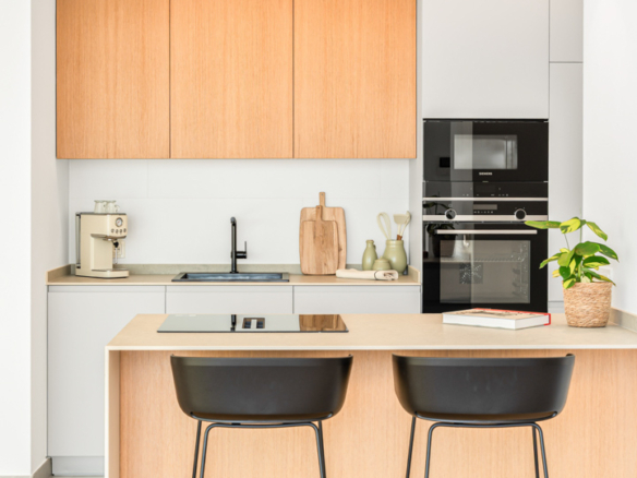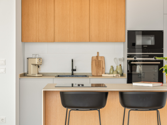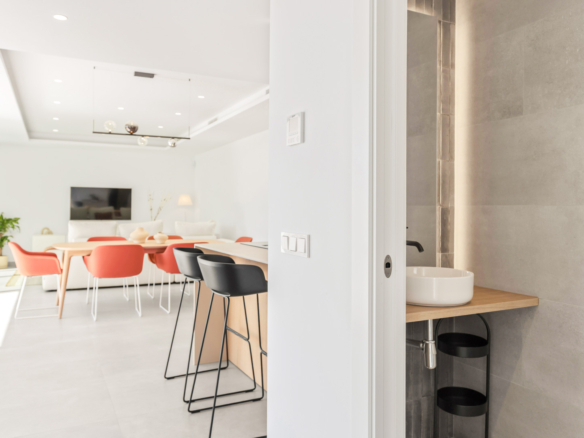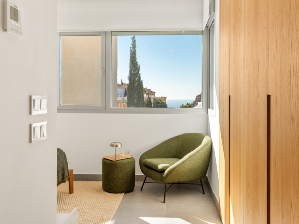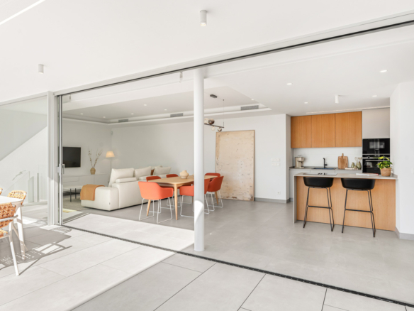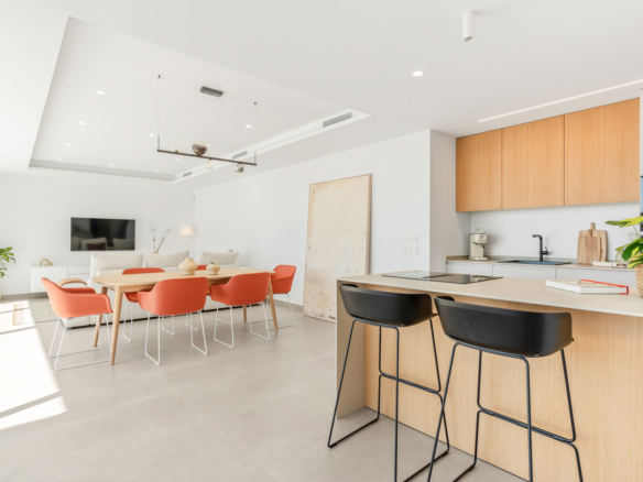 Wohnzimmer, Essbereich und Küche sind offen gestaltet, großzügig geschnitten und bieten direkten Zugang zum Außenbereich. Große Fensterflächen verbinden den Innenraum mit der Terrasse und dem privaten Pool und schaffen einen funktionalen und ausgewogenen Wohnbereich mit freiem Meerblick.