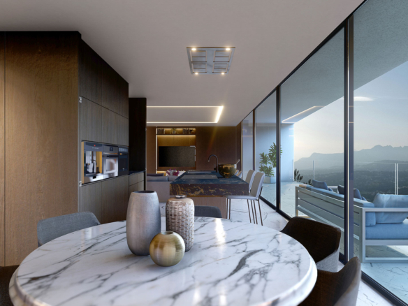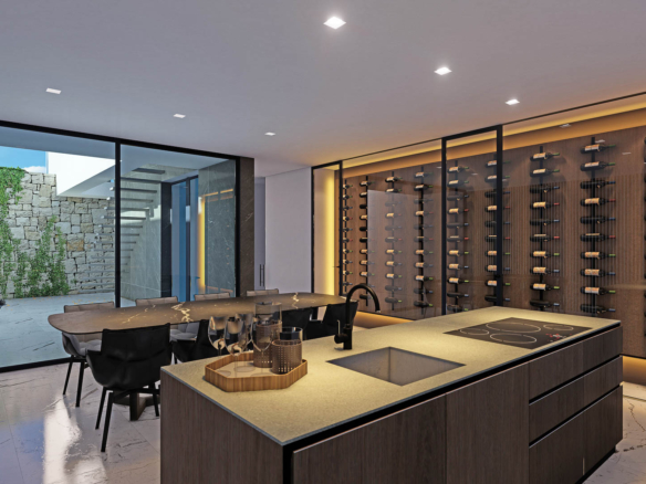 Die bei der Gestaltung verwendeten Materialien wurden sorgfältig ausgewählt, um die Harmonie der Landschaft zu respektieren und eine vollständige Integration in das Gelände zu erreichen. Der Zugang zum Anwesen erfolgt über eine ruhige Sackgasse, die Privatsphäre und Sicherheit bietet. Ein eleganter und sorgfältig gestalteter Weg führt den Besucher durch die verschiedenen Räume und enthüllt die großartigen Eigenschaften dieses Anwesens. Der Haupteingang führt in eine geräumige Diele, die nahtlos in den Tagesbereich übergeht, wo die avantgardistische Küche, das Wohnzimmer und das Esszimmer zu einem hellen, offenen Raum verschmelzen.