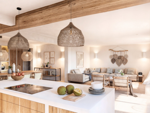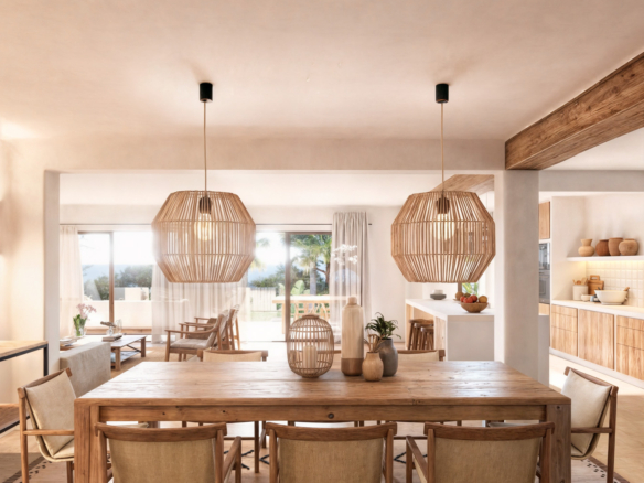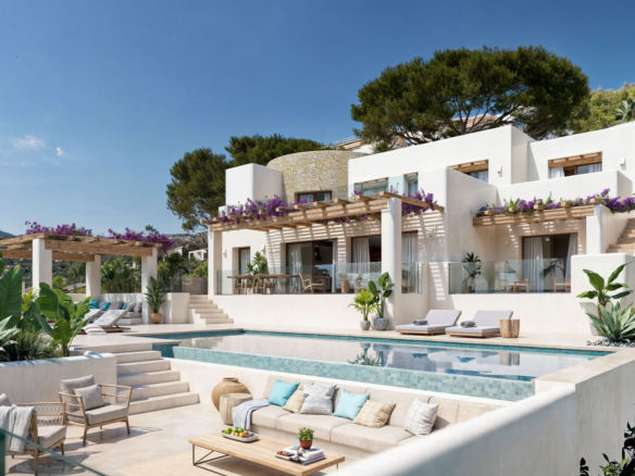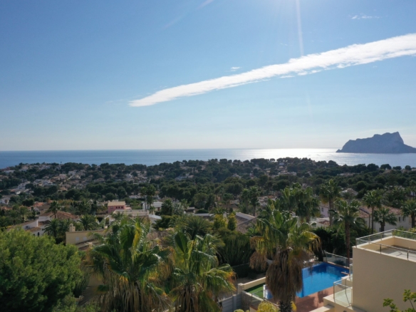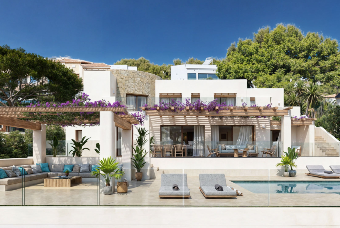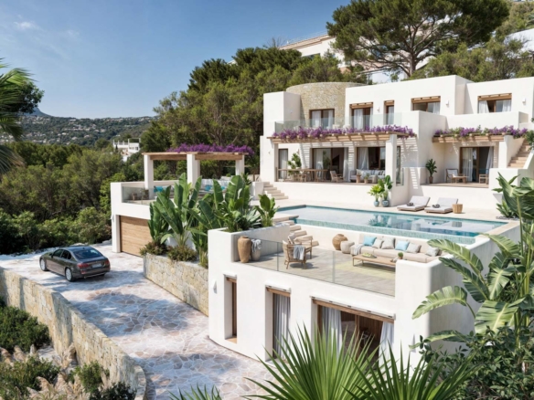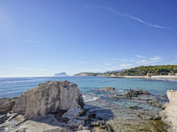 Exklusive ibizenkische Villa mit Panoramablick auf das Meer und den Peñon de Ifach zu verkaufen in San Jaime, Moraira Diese atemberaubende Villa im ibizenkischen Stil, die sich in der prestigeträchtigen Urbanisation San Jaime in Moraira befindet, bietet eine einzigartige Kombination aus Luxus, Komfort und Design in einer privilegierten Umgebung. Sie ist nur wenige Gehminuten vom Golfplatz von Moraira und allen wichtigen Annehmlichkeiten wie Restaurants, Geschäften und feinen Sandstränden entfernt. Mit fünf geräumigen Schlafzimmern und fünf en-suite Badezimmern, von denen jedes sorgfältig entworfen wurde, um ein Maximum an Komfort und Privatsphäre zu bieten, ist diese Villa ideal für Familien oder als Gästeunterkunft. Jedes Schlafzimmer hat Zugang zu einem eigenen Außenbereich in Form einer Terrasse oder eines Balkons, so dass Sie die natürliche Umgebung und die Aussicht von jedem Zimmer aus genießen können. Das Design umfasst auch eine elegante Gästetoilette im Erdgeschoss, ideal für gesellige Zusammenkünfte. Das Innere der Villa spiegelt einen zeitgenössischen Stil mit mediterranen Akzenten wider, wobei hochwertige Materialien und exquisite Details im Vordergrund stehen. Aluminiumschreinerarbeiten, große Fenster und helle Oberflächen lassen natürliches Licht in jeden Winkel des Hauses fließen und schaffen eine warme und einladende Atmosphäre. Außerdem ist die Villa mit einer Fußbodenheizung und einer kanalisierten Klimaanlage ausgestattet, die das ganze Jahr über für Ihren Komfort sorgen. Das Äußere des Anwesens spiegelt den Geist der ibizenkischen Architektur wider, mit großzügigen Terrassen, Gärten und Entspannungsbereichen. Vom Infinity-Pool aus, der so angelegt ist, dass er in den Horizont übergeht, können Sie den unvergleichlichen Blick auf das Meer und die natürliche Umgebung genießen, der diese Villa so einzigartig macht. Die Lage ist ein weiterer Pluspunkt dieses Projekts. Sie befindet sich im Herzen von San Jaime in Moraira, in einer Enklave, die Privatsphäre, Ruhe und direkten Zugang zu luxuriösen Dienstleistungen vereint. Golfliebhaber werden sich über den nahegelegenen Golfclub freuen, während diejenigen, die Entspannung und Gastronomie suchen, nur wenige Autominuten entfernt eine große Auswahl an Restaurants und Bars finden. Kurzum, diese ibizenkische Villa ist ein architektonisches Juwel, das einen exklusiven Lebensstil an einem der begehrtesten Orte der Costa Blanca bietet. Von den geräumigen Zimmern über den atemberaubenden Panoramablick bis hin zur Nähe zum Golfplatz und zu den Annehmlichkeiten wurde jedes Detail so gestaltet, dass es ein einzigartiges Erlebnis von Luxus und Wohlbefinden bietet.