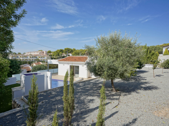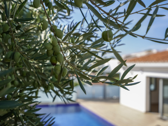 Im Außenbereich finden Sie einen beheizten Pool mit beheizter Außendusche, eine überdachte Terrasse und eine offene Terrasse mit einer Markise, die mit einem Wind- und Regensensor ausgestattet ist. Das Haus ist von einem schönen, pflegeleichten Garten mit Obstbäumen und mediterraner Bepflanzung umgeben.