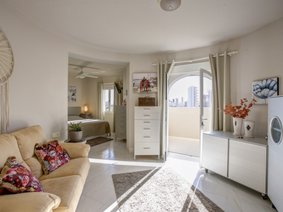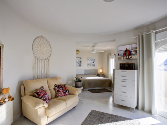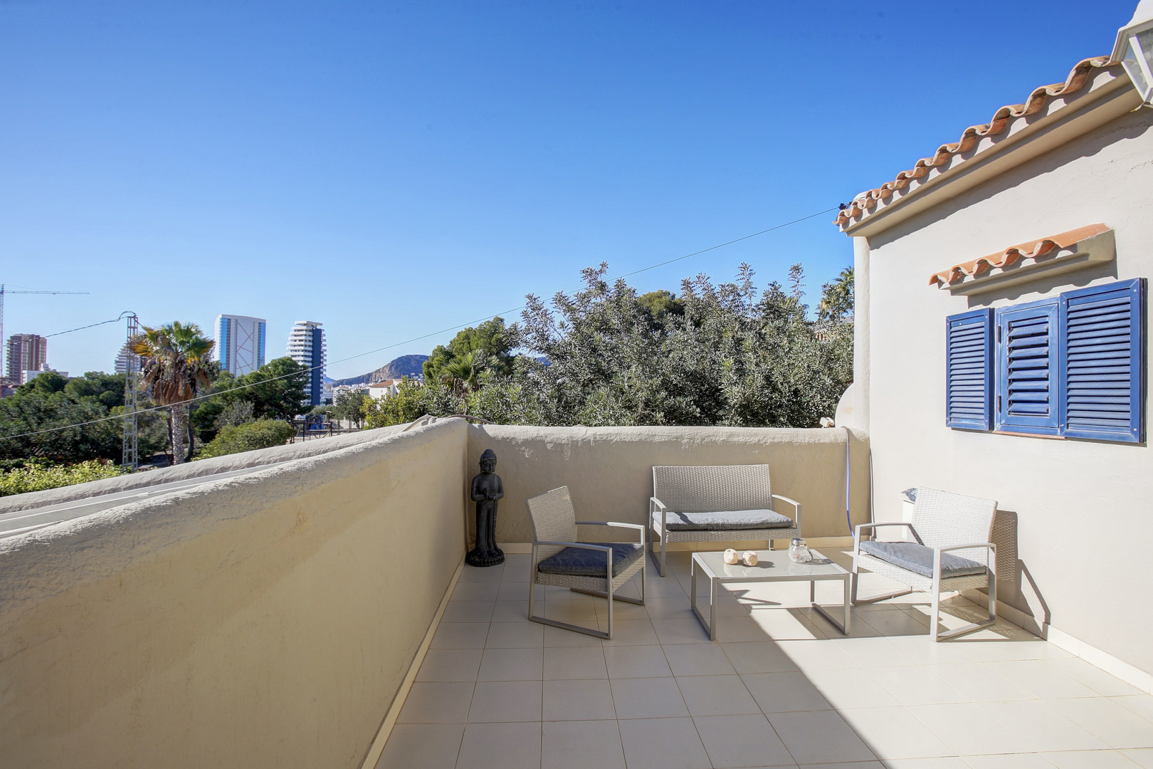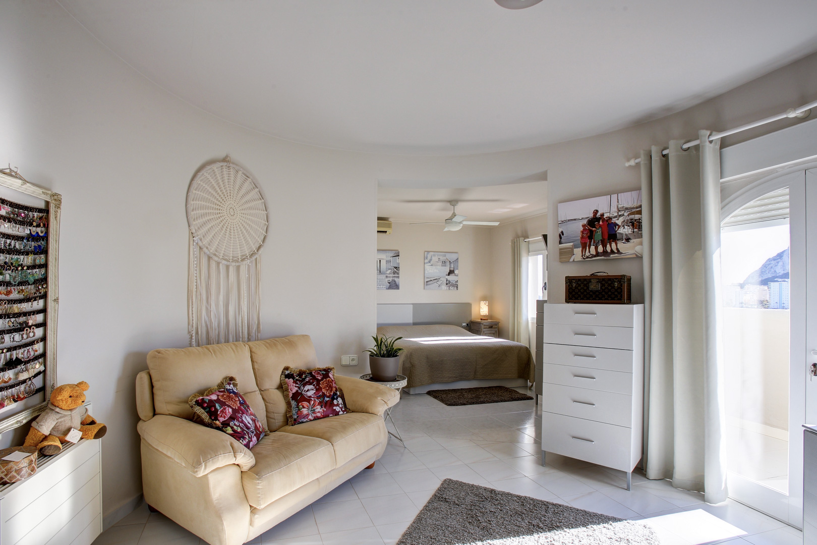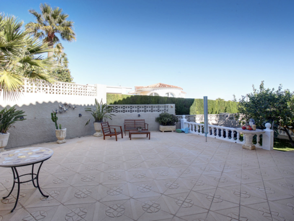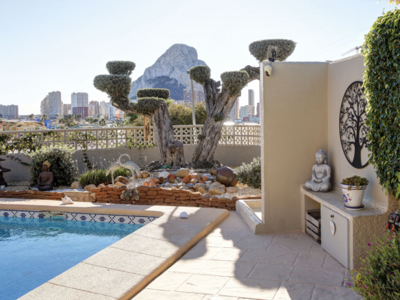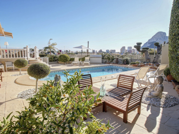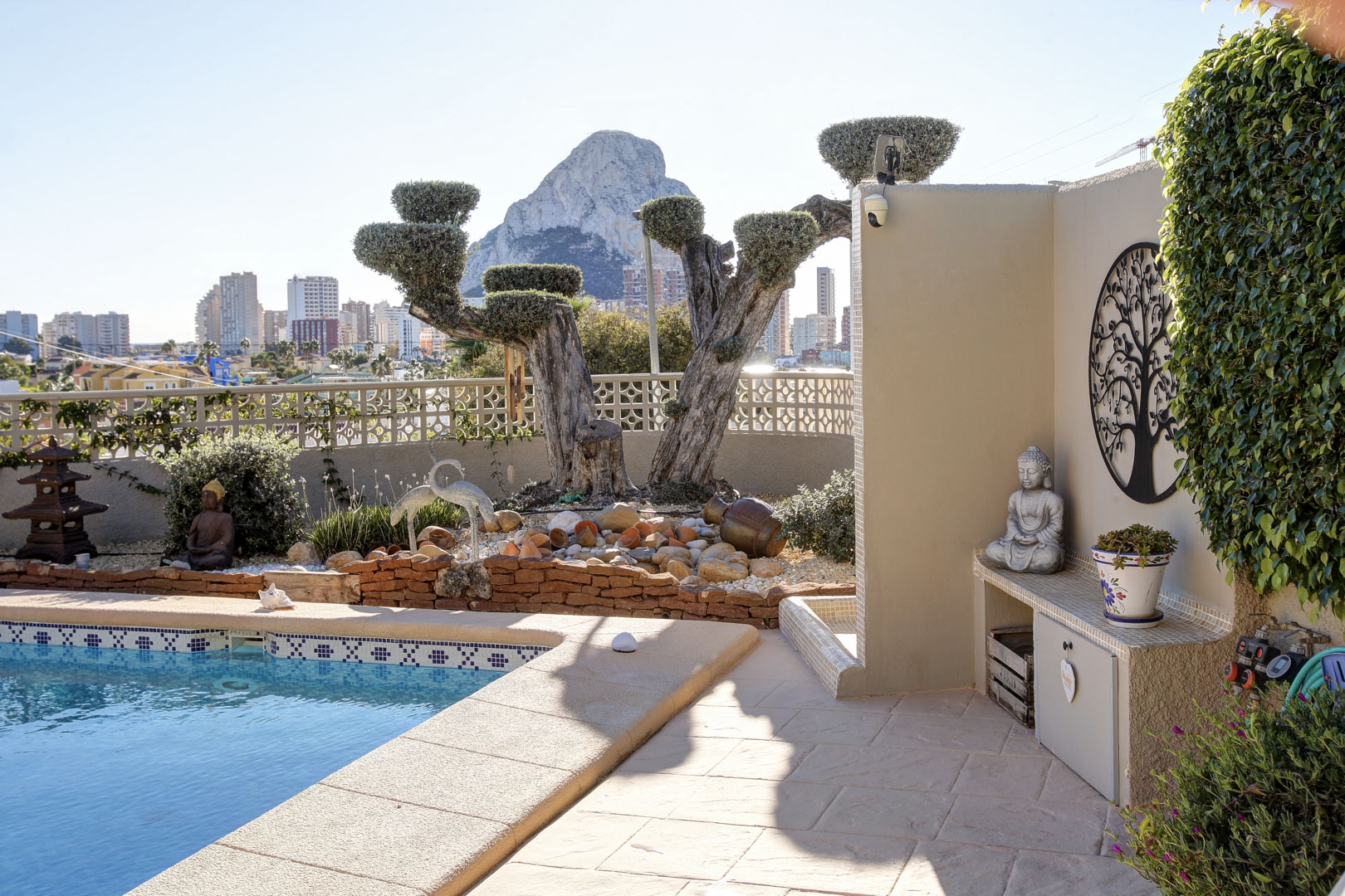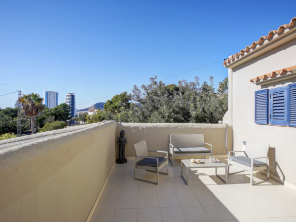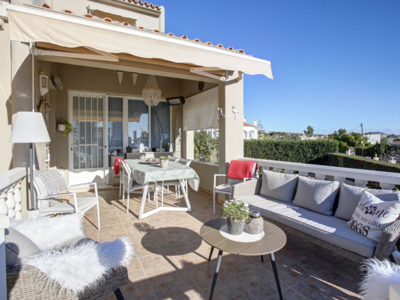 Der Außenbereich besteht aus einer überdachten und einer offenen Terrasse mit herrlichem Blick auf das Meer und den Peñón de Ifach.