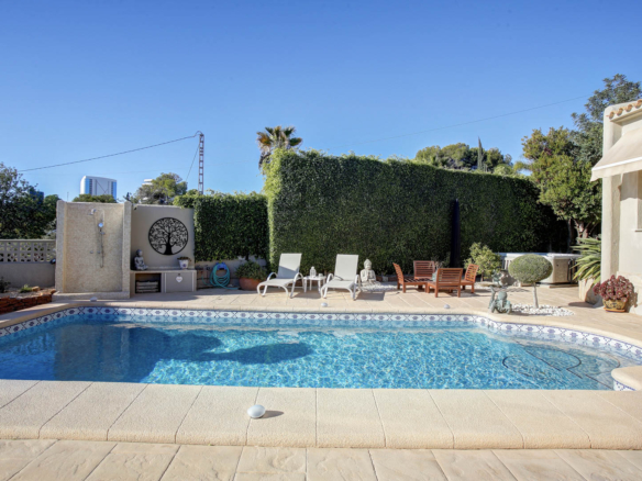 Exklusive Villa in einer der begehrtesten Gegenden von Calpe, aufgrund ihrer ausgezeichneten Südlage, der Ruhe und der Nähe zu allen Annehmlichkeiten. Nur 600 m vom Strand entfernt und nur wenige Schritte von Supermärkten, Restaurants und dem Stadtzentrum.