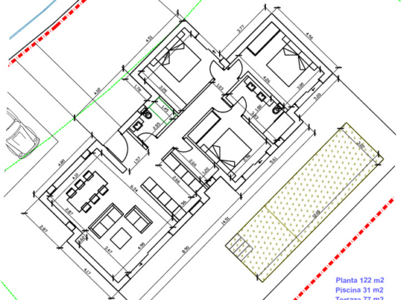 Modern ground floor new construction villa for sale in Pedreguer, the project already has a building license and can be delivered in 12 months. The villa offers nice panoramic views of the beautiful surroundings, it is oriented south and is located close to the center of Pedreguer. There is an entrance hall, a living dining room with an open kitchen, a utility room,2 double bedrooms sharing a bathroom and a master bedroom with an en suite bathroom.The total area of the villa is 122m2. Outside there is a 77m2 terrace with a 10 x 3m swimming pool.