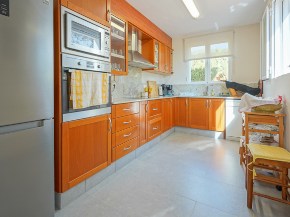 Upon entering the ground floor, you are welcomed into a generous living-dining room, where an atmospheric stove ensures cosy evenings. There is also a separate fully equipped kitchen, a guest toilet, a convenient storage room and a large garage. The living room offers direct access to an inviting poolside terrace, where you can enjoy sunny days and relaxing evenings. A covered terrace with a barbecue area completes the outdoor living area, ideal for hosting guests or family gatherings.