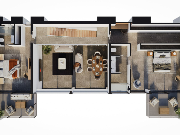 The villa is spread over two floors. The ground floor consists of a spacious living-dining room with an adjoining open kitchen fully equipped with Bosch appliances and a cooking island. Thanks to the extra-high windows and double ceiling, the living room is an oasis of light and space. Next to the living room is a double bedroom with an en-suite bathroom. For extra comfort, there is also a guest toilet. The upper floor consists of two spacious bedrooms, both with en-suite bathrooms and private terraces. The master bedroom also has a spacious dressing room.
