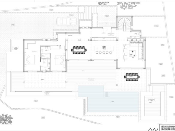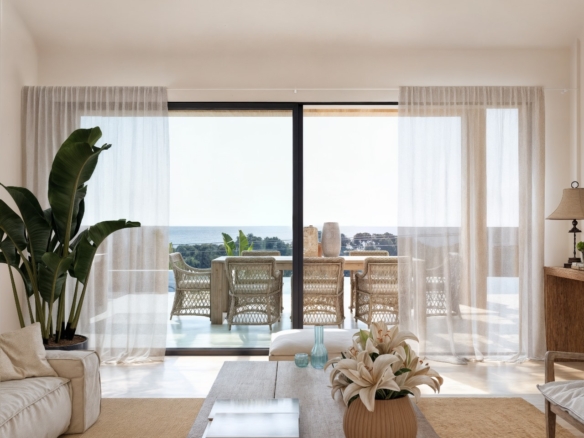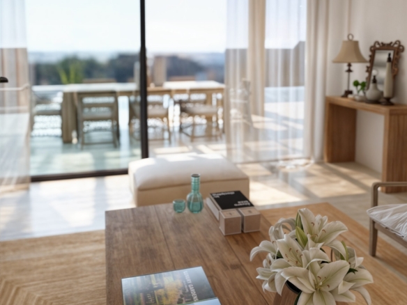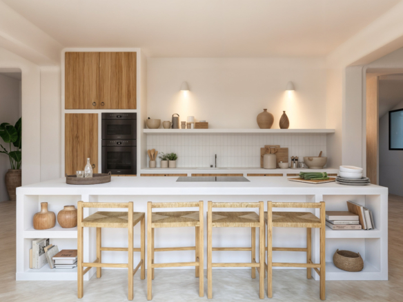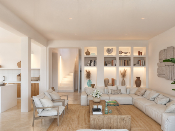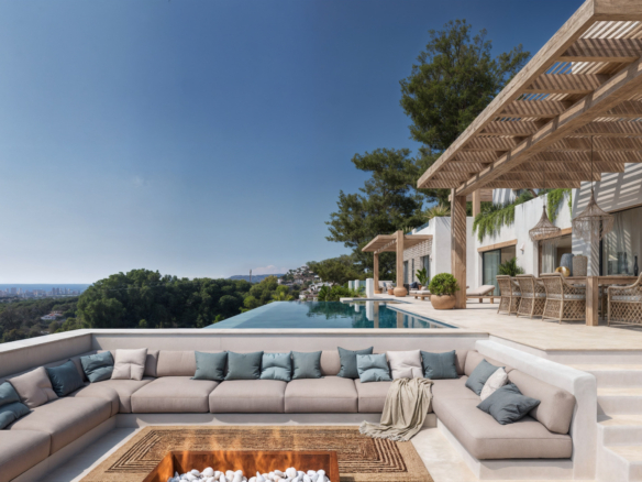 The kitchen will be finished in the characteristic Ibiza style, with natural tones and high-quality finishes, including built-in appliances. The bathrooms are finished in mortar, microcement or tiling, with ROCA sanitary ware and FIMA SPILLO taps in elegant matt black. The infinity pool is lined with Bassetes mosaic tiles and is pre-installed for heating.