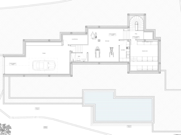 The basement comprises a spacious garage, a gym, a cinema room and an additional bathroom. From the living room, a large sliding window leads to the sunny terrace with infinity pool, several pergolas and an inviting lounge area, surrounded by a Mediterranean garden.