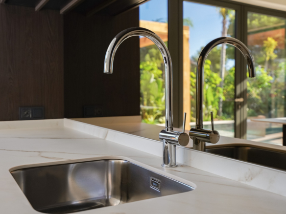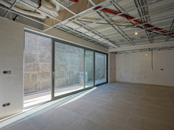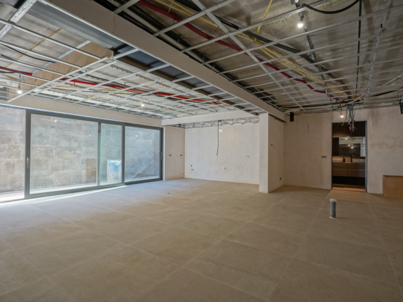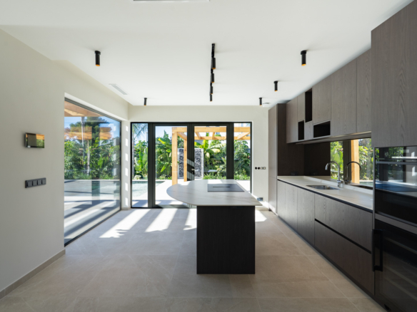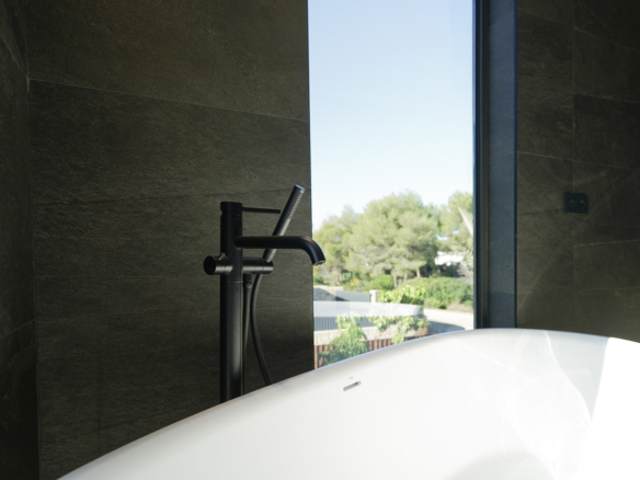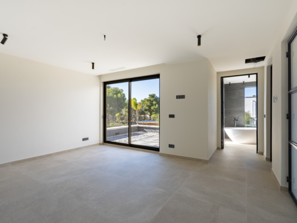 The villa is distributed over three floors. You enter the home on the ground floor through a spacious, bright hall where the guest toilet is also located. Further down the corridor you will find two double bedrooms, each with its own bathroom. The hallway leads to the generous living-dining room with a modern open kitchen with cooking island, fully equipped with Bosch appliances. The staircase, bathed in natural light thanks to the large windows, takes you to the upper floor. Here you will find the master bedroom with a luxurious ensuite bathroom with shower, bathtub and double washbasin, as well as a dressing room and a large private terrace.