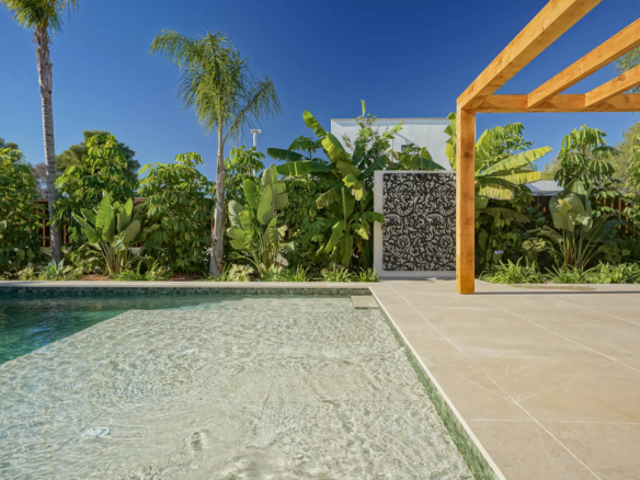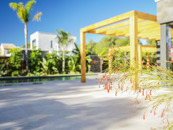 Outside you will find a beautiful 13 × 5 metre Bali-style saltwater pool with sunbathing area and pre-installation for heating. The surrounding 212 m2 terrace is equipped with two Iroko-wood pergolas, and thanks to the south-facing orientation you can enjoy the sun here all year round.