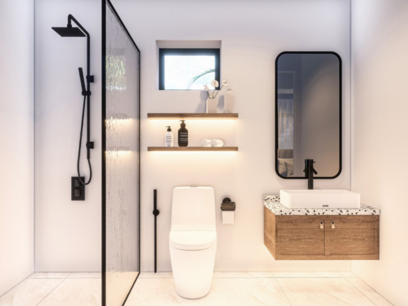 Climate control is guaranteed thanks to a ducted air conditioning and heating system, powered by a Panasonic reverse heat pump, which ensures an ideal temperature all year round. The bathrooms are equipped with modern sanitary ware, including wall-hung toilets, bathroom furniture, contemporary shower trays and black or chrome taps, with functionality and style in every detail.