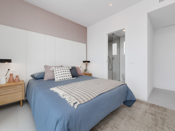 The upper floor houses two additional bedrooms, both with en-suite bathrooms, including the master bedroom with a private terrace and views of the natural surroundings.
