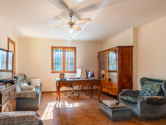 The home, with views of the majestic Segaria, is divided into spacious, bright, and inviting rooms. The living-dining room, dominated by a wood-burning fireplace, invites family gatherings and cozy evenings. The fully equipped separate kitchen opens onto a large terrace, ideal for enjoying meals al fresco. The living area features six bedrooms, three of them with en-suite bathrooms, as well as four full bathrooms, with the possibility of further expanding the space with additional rooms.