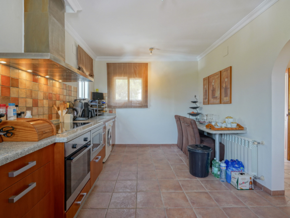 An automatic gate gives access to the property with the driveway immediately splitting into two to give you the choice of parking at the entrance to the main house or at the entrance to the guest house. If you park at the main house, stairs lead to the front door. You enter a stylish hallway with a spacious, fully equipped kitchen to the right. The hallway flows into the living-dining room where you will also find a small office. Through a corridor, where there is an additional bathroom, you reach the master bedroom with walk-in wardrobe and en-suite bathroom. You can enjoy beautiful views of the landscape from all rooms. From both the living room and the bedroom, there is direct access to the poolside terrace via sliding windows. There is also a covered terrace on this floor, an outdoor kitchen with a bar and an outdoor shower. The guest house comprises a kitchen, a dining area from where you can also enjoy the beautiful views of Sierra de Bernia, a lounge, a bedroom with an en suite bathroom and two bedrooms sharing a bathroom. Opposite the guest house is a large room of about 44 m2 with several windows, ideal to transform into an extra bedroom, gym or a cosy studio. The guest house and studio share a private terrace. The villa has air conditioning in all rooms, central heating via radiators, shutters and built-in wardrobes. There is also camera security consisting of several cameras and an alarm system. The villa is surrounded by a low-maintenance garden equipped with automatic irrigation. There is also a garage.