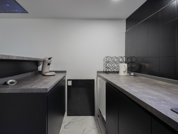 The upper floor features a modern living and dining room with fireplace, a fully equipped kitchen, two spacious bedrooms, a dressing room and a luxurious bathroom with double shower and bathtub. The living room opens onto a large south-facing terrace with stunning views over Calpe and the Peñon de Ifach. The kitchen opens onto a covered terrace, ideal for outdoor dining all year round.