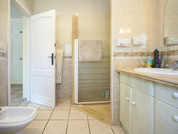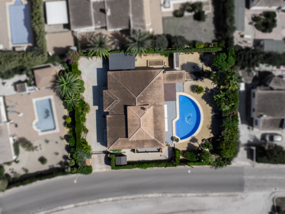 A few steps lead to the veranda at the front door and into an entrance hall. From the hall, you enter the spacious, open kitchen with an adjoining dining area. Next to the dining area is a living room with a fireplace. The eastern side of the villa features a master bedroom with an en-suite bathroom and two bedrooms with a shared bathroom. All bedrooms have built-in wardrobes, shutters and air conditioning. The villa features underfloor heating and a fireplace to guarantee maximum confort all year round. Besides the villa has a laundry room located in between the kitchen and the hallway. Outside, there is a spacious covered terrace on both the south and west side of the villa. There is also a large swimming pool with an outdoor kitchen and an outdoor bathroom. Ideal to spend long summer evenings outdoors. The villa is surrounded by a mature Mediterranean garden and has several parking spaces, a carport and a storage room.