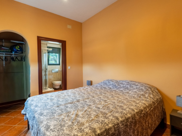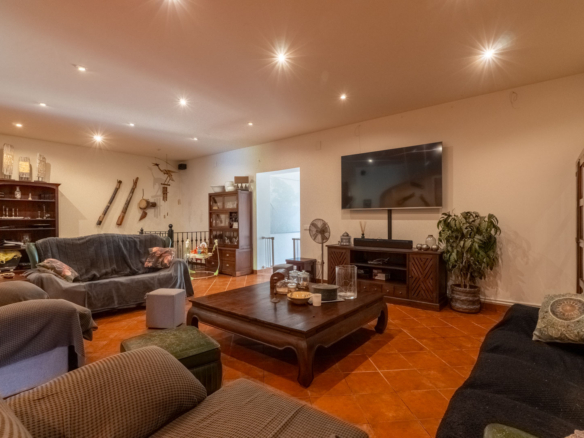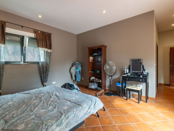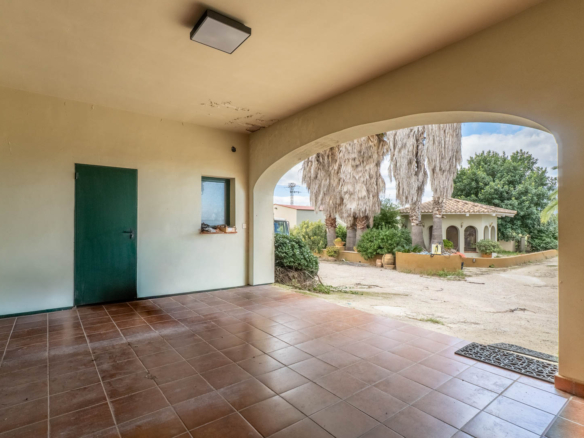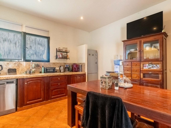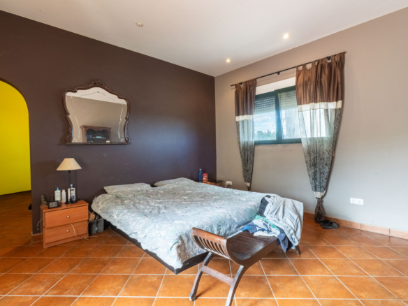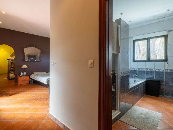 In the more private outdoor area, you will find a large swimming pool that reaches just over 3 meters in depth, inviting you to immerse yourself in silence and privacy, all surrounded by gardens and palm trees. For convenience, there is a full outdoor bathroom. Further back, there is a large installation of 30 state-of-the-art solar panels, guaranteeing energy self-sufficiency.