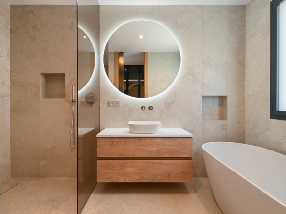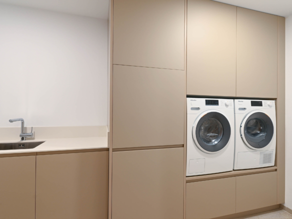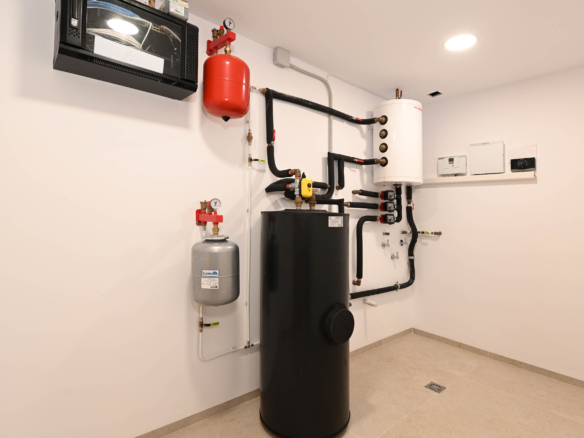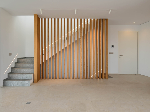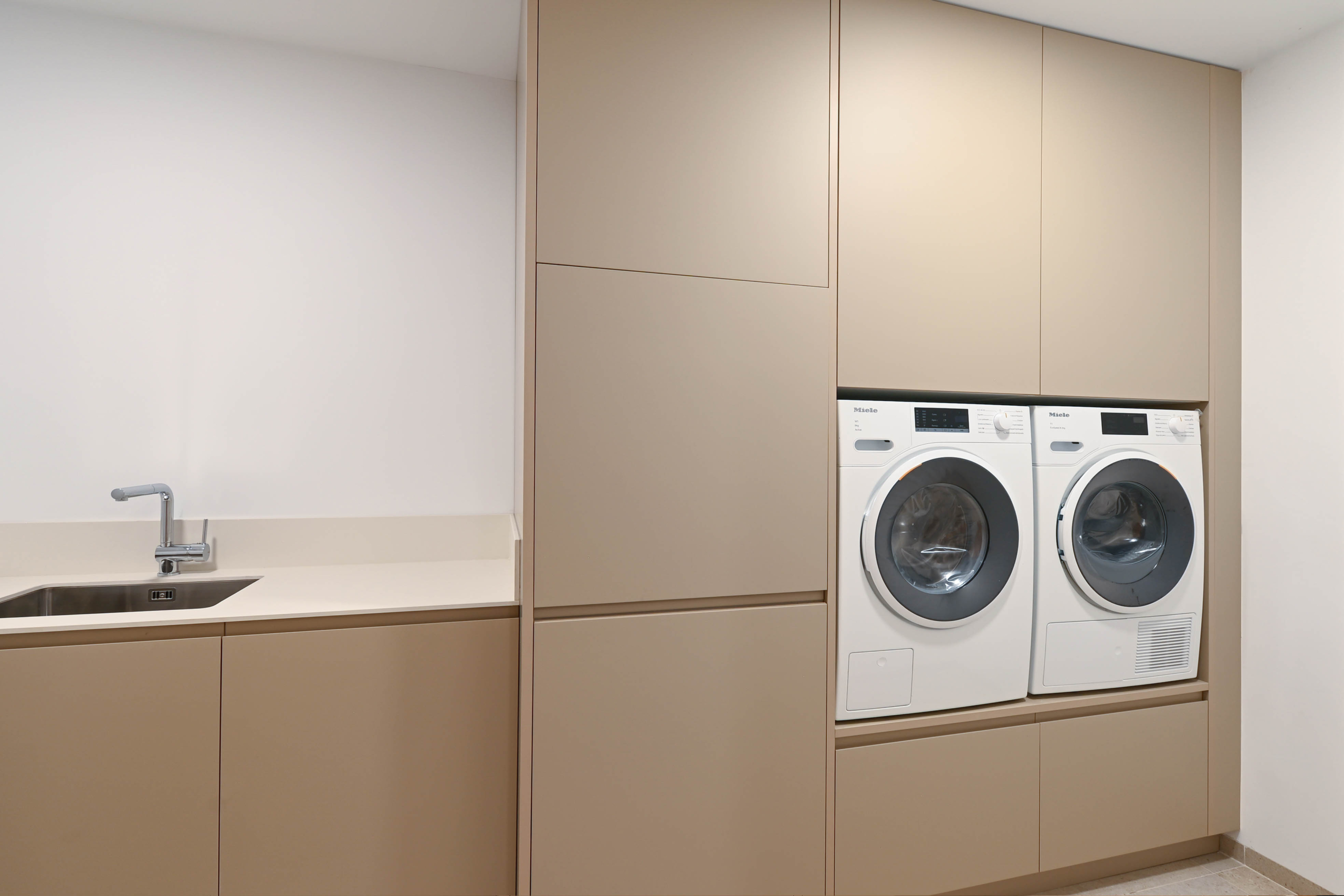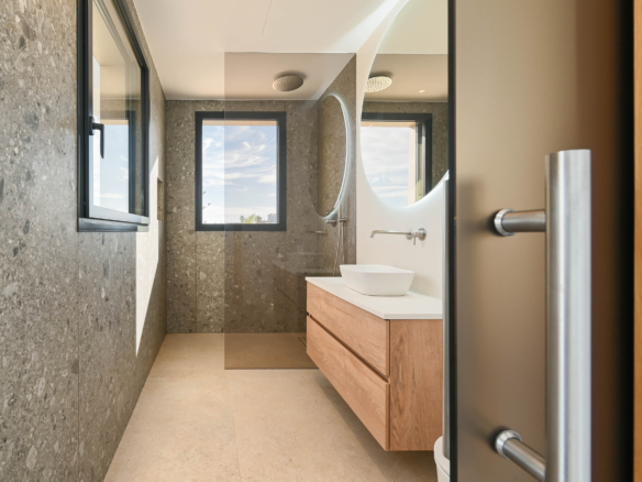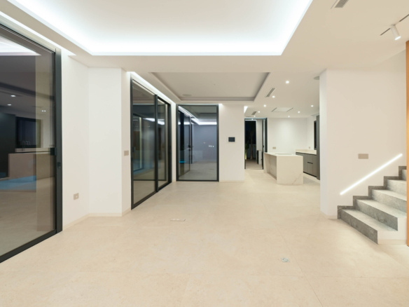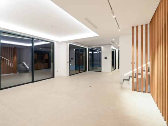 On the ground floor, you will find a spacious, fully equipped designer kitchen with cooking island and direct access to the atmospheric barbecue area next to the pool – perfect for cosy summer evenings. The bright, open-plan living space exudes comfort and style and is complemented by a guest toilet and two bedrooms, one with en suite bathroom and dressing room. Thanks to the large sliding windows, both the living area and the bedrooms open up to the spacious pool terrace, where indoor and outdoor living blend seamlessly. The upper floor offers two comfortable double bedrooms, each with its own en suite bathroom and private terrace, ideal for ultimate peace and privacy. The basement is a true wellness and relaxation oasis, with a heated indoor pool that enjoys natural light through a window to the outdoor pool, a gym, sauna, spacious home cinema, laundry room, an extra bathroom and a multi-purpose games room.