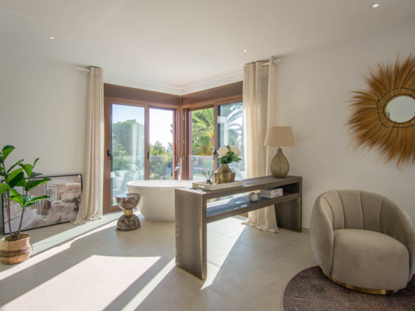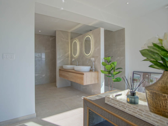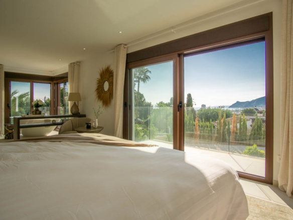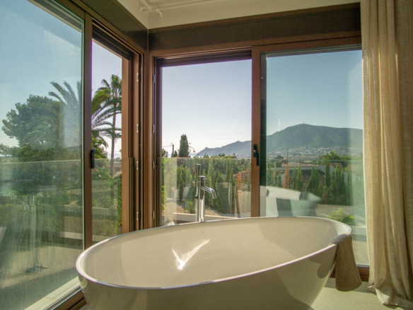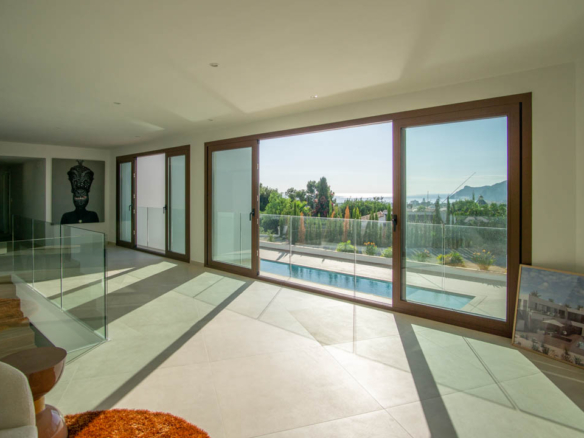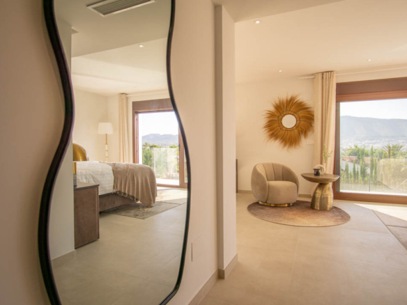 This spectacular, luxuriously finished villa is ideally located in the exclusive El Planet area of Altea, surrounded by nature and tranquillity. The beautiful beaches, boulevards, restaurants and beach bars of Altea and Albir are just a stone’s throw away. Through the reception hall on the first floor, you have direct access to a room that can serve as a bedroom, office or children’s playroom. The next rooms are two Master Suites. In these suites, you feel like you are in a Boutique Hotel; a holiday feeling in your own home! A retreat where you can wake up every day with a spectacular sea view, read a book in your sitting area or enjoy a soothing bath overlooking your garden.