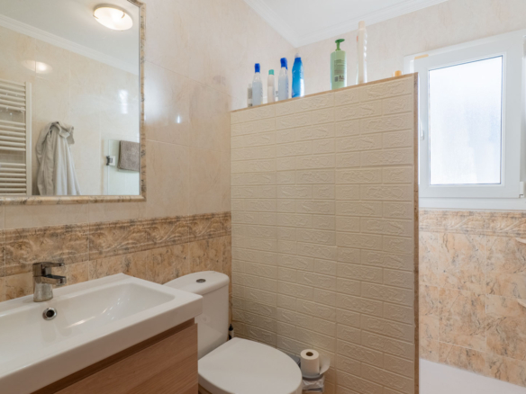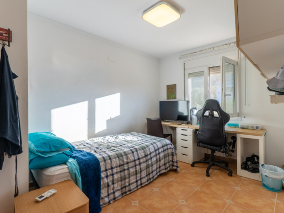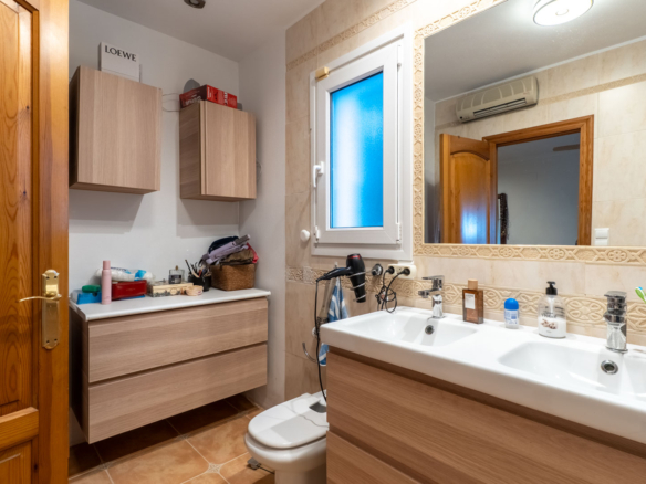 Two exterior staircases lead to the main floor, where natural light takes center stage. A welcoming entrance hall opens to the master bedroom suite, which has access to a private terrace. On this same floor, you’ll also find two bedrooms with built-in wardrobes, a full bathroom, an elegant living-dining room with access to the terrace, a separate kitchen, and a glass-enclosed laundry room that adds convenience and spaciousness to everyday life. From this floor, the sea views are a true gift: a panoramic vista stretching from Cullera to Les Rotes, creating a perfect setting to enjoy both sunrise and sunset.