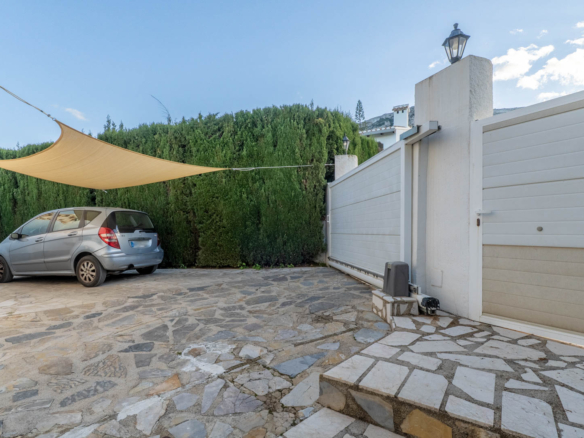 Upon arrival, a perfectly utilized exterior welcomes you: a carport with a pergola, an outdoor kitchen with a barbecue, a refreshing swimming pool surrounded by relaxation areas, and an outdoor shower that completes this inviting open-air environment.