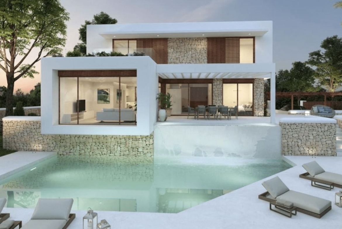 WITH LICENSE, KEY READY WITHIN 12 MONTHS AFTER SIGNING CONSTRUCTION CONTRACT. The villa has a built area of 300 m2, of which 200 m2 is divided over two floors inside and stands on a plot of 1,000 m2. The house is furnished according to the most modern and highest quality standards. The outdoor space has been designed to be enjoyed with covered terraces and open plan living areas that allow for relaxed outdoor living from March to October. There are three bedrooms with en suite bathrooms plus a guest toilet, a luxurious open kitchen and a very spacious dining and living room. This opens out to a beautiful covered terrace overlooking the garden and pool. Outside there is a Mediterranean garden.