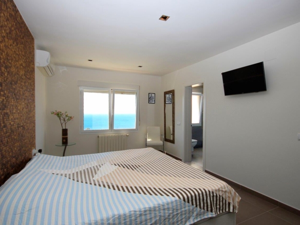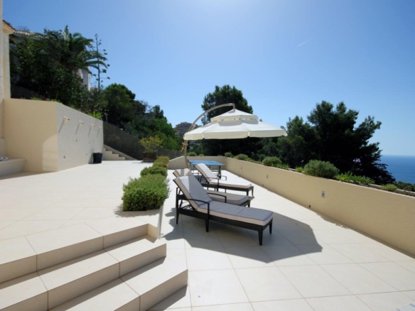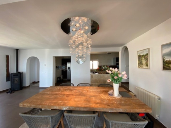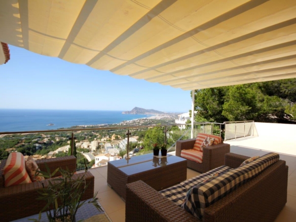 Beautiful very well maintained south facing Mediterranean villa with fantastic panoramic sea views up to Alicante. Only 5 car minutes from the charming village of Altea la Vella with shopping facilities, bars and restaurants. Also the golf course and clubhouse of Don Cayo is 10 minutes by car. The villa was completely renovated in 2010 and the facades and outdoor kitchen have been recently updated. The house has an entrance hall on the second floor which gives access to the spacious living dining room with lots of natural light. There is a partly open fully equipped modern kitchen with American fridge-freezer. There is also a spacious terrace with an outdoor toilet, a utility room, an outdoor kitchen with BBQ and a lounge that is partly covered and partly open. Also still on the ground floor there is a guest toilet, a master bedroom with en suite bathroom and dressing room. On a lower level there is a double bedroom with en suite bathroom dressing room. Furthermore, there are 2 more guest bedrooms sharing a bathroom. Outside there is another garage of 31.7m2 for 2 cars’, a heated pool of 42m2 by means of a heat pump. A large pool terrace and shower room integrated into the house. Installation of 14 solar panels.