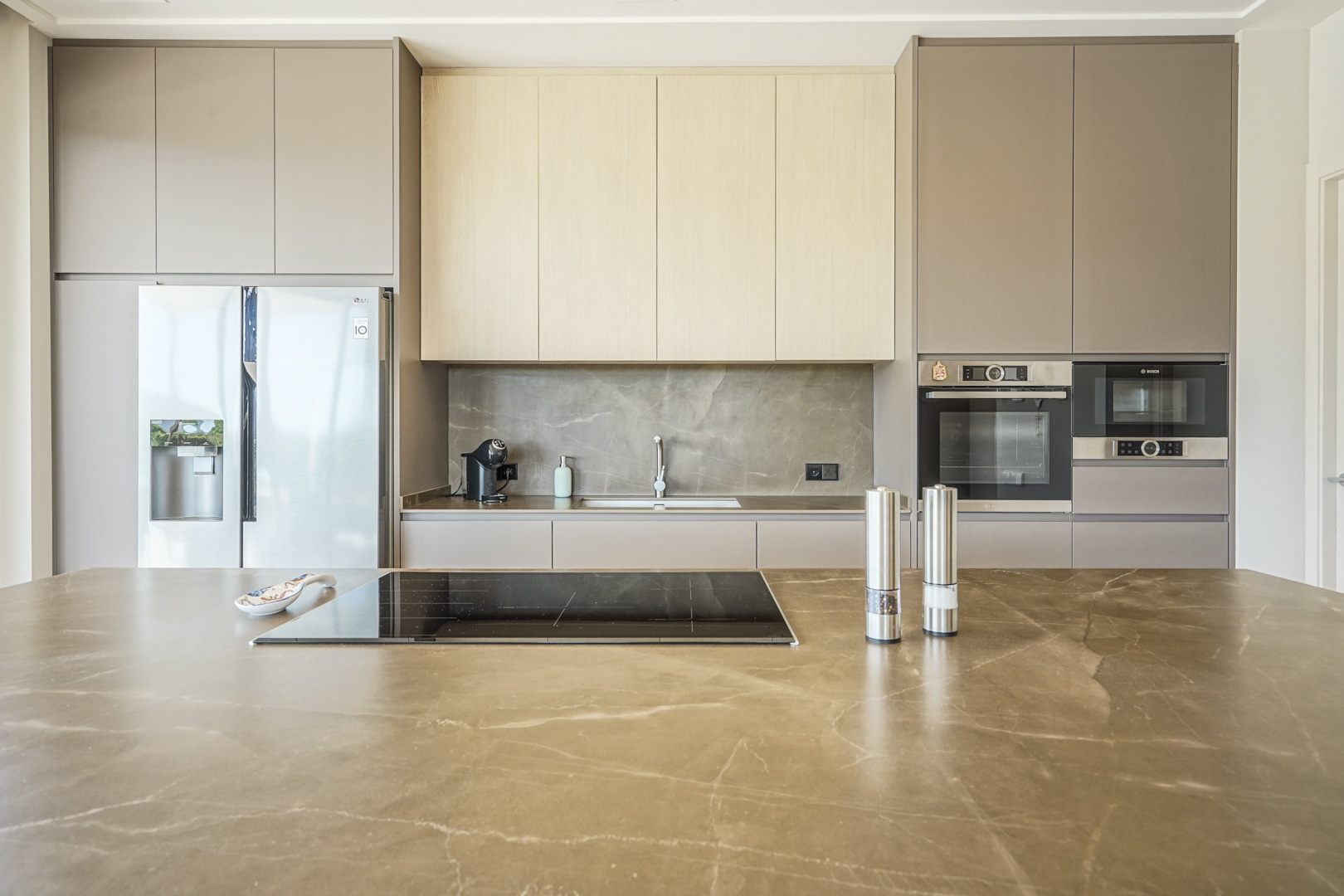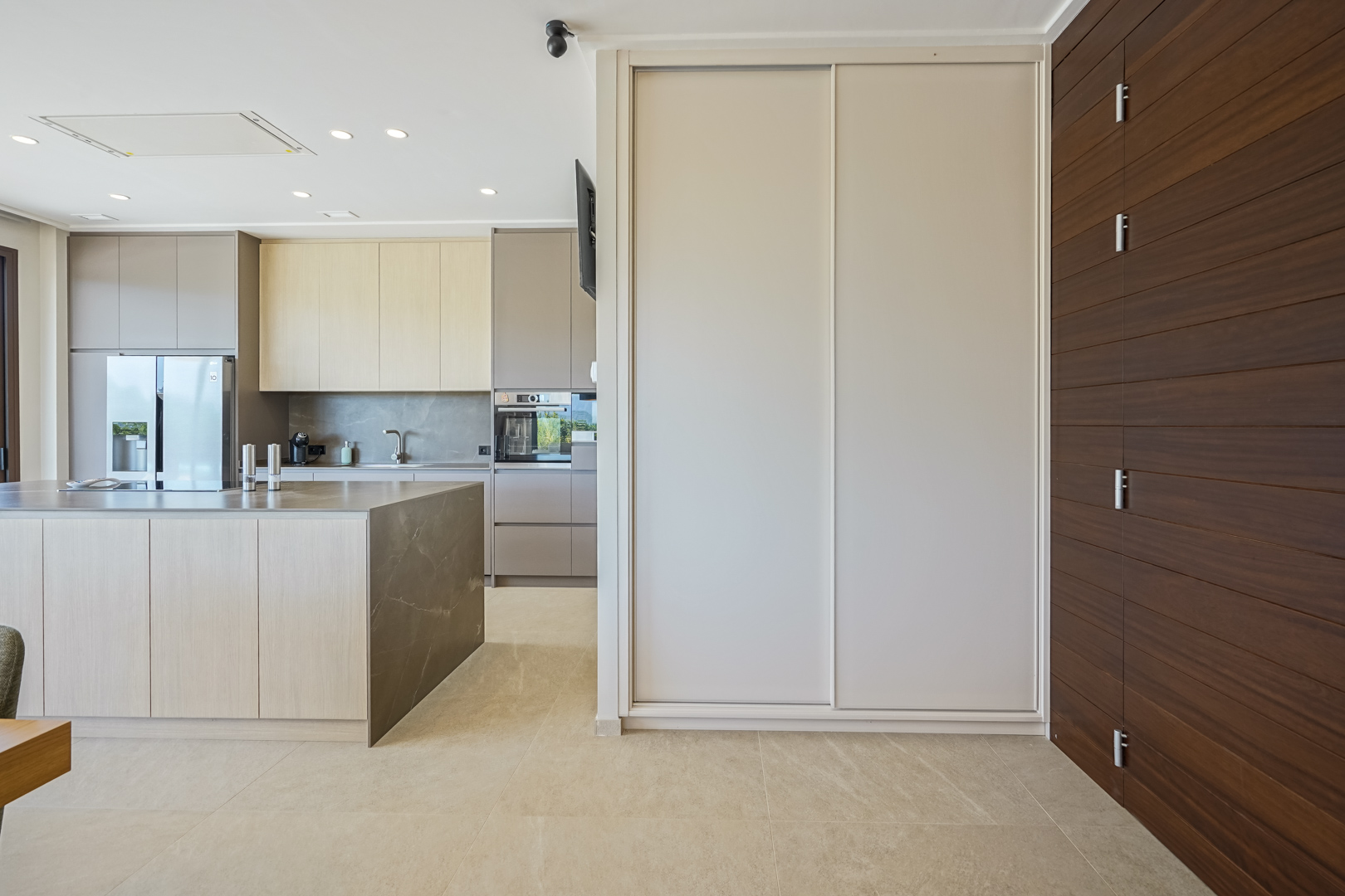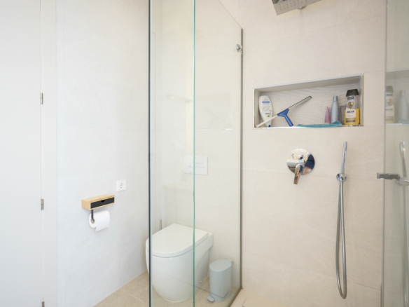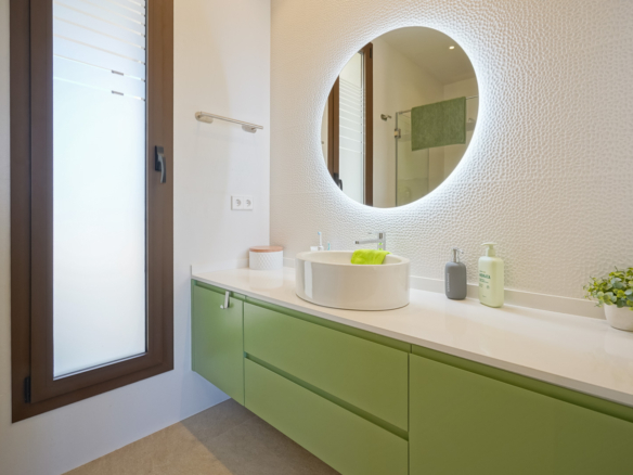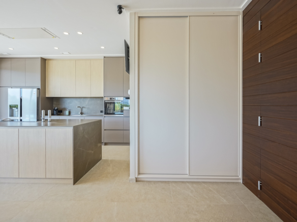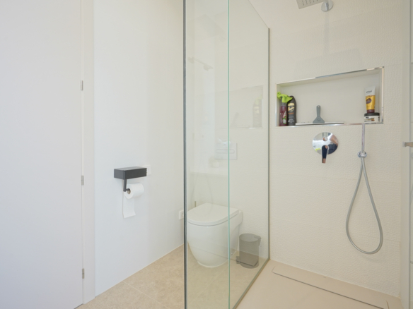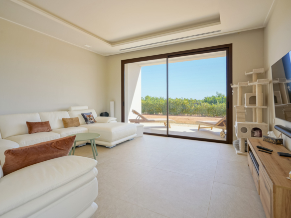The villa has a spacious living and dining room with an open-plan kitchen and cooking island. The kitchen is equipped with luxury Bosch appliances and adjoins a practical laundry room. There are also three double bedrooms and two bathrooms.