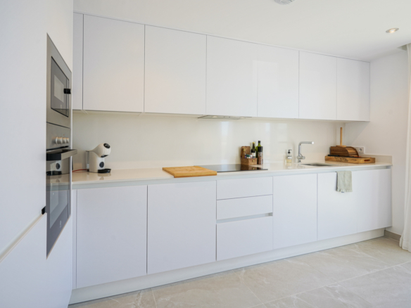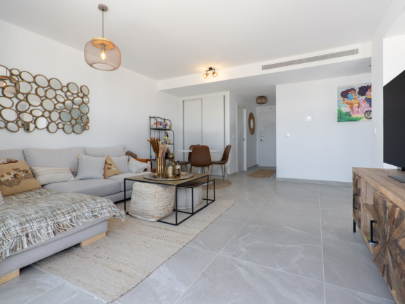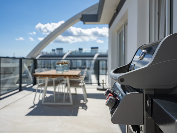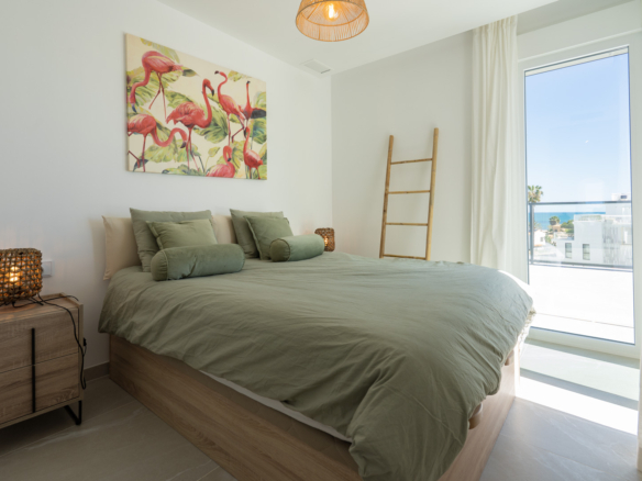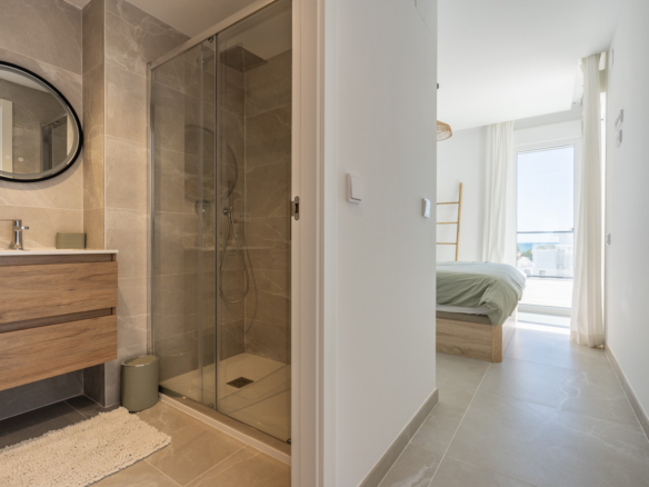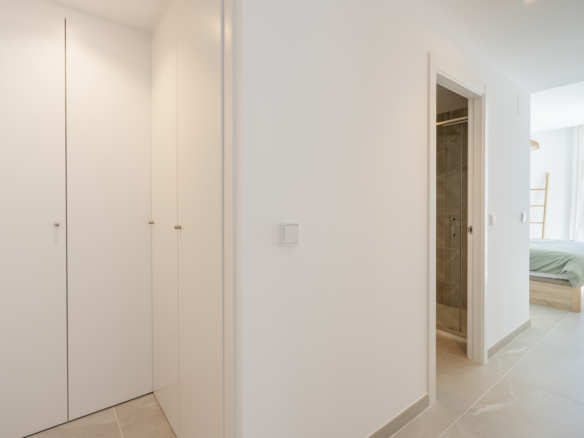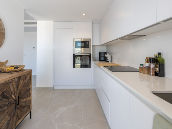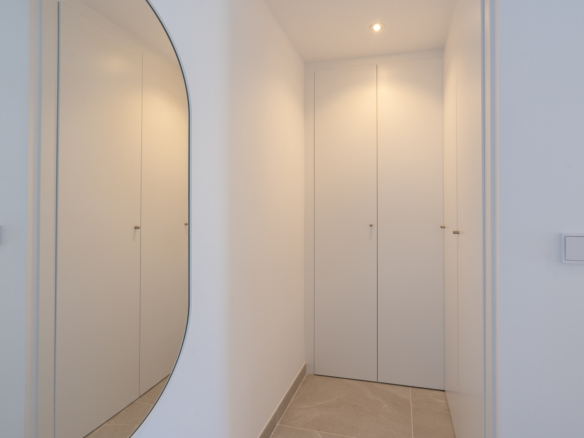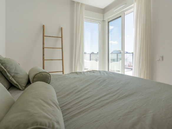 Avec 84,90 m2 d’espace utilisable et une terrasse de 51,46 m2 au même étage, ce penthouse offre espace et confort. Vous entrez dans un hall élégant avec une chambre double spacieuse sur la gauche et une salle de bains sur la droite. Le hall mène au salon, où la vue spectaculaire sur la mer attire immédiatement le regard et où des fenêtres coulissantes donnent accès à la terrasse. La cuisine moderne et entièrement équipée est adjacente au salon et dispose également d’un accès direct à la terrasse. Plus loin dans le couloir se trouve une deuxième chambre double avec accès à la terrasse et au bout du couloir se trouve la chambre principale avec salle de bains en-suite, dressing et accès direct à la terrasse.