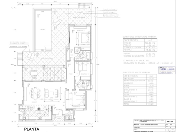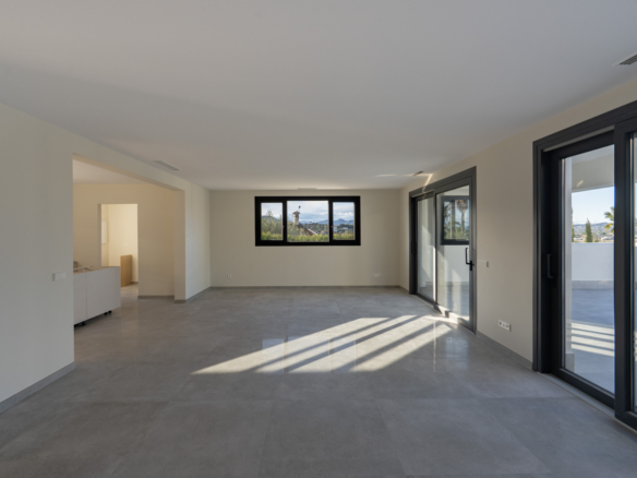Cette villa neuve exclusive, située dans la belle urbanisation de Piver, offre une vue imprenable sur l’imposant Montgó et l’arrière-pays montagneux. La villa est située sur un terrain spacieux de 1 147,94 m² et est entièrement conçue de plain-pied pour un confort et une accessibilité optimaux. À l’entrée, un hall élégant avec des toilettes pour invités mène au spacieux salon-salle à manger, où de grandes fenêtres laissent entrer une lumière naturelle abondante et offrent un magnifique panorama. À côté se trouve une cuisine moderne entièrement équipée avec une buanderie pratique qui donne directement accès à l’extérieur. Les baies vitrées du salon s’ouvrent sur une terrasse accueillante avec piscine, idéale pour profiter de la vue et du climat méditerranéen. La partie nuit comprend trois chambres, dont une élégante chambre principale avec salle de bains attenante et accès direct à la terrasse, tandis que les deux autres chambres partagent une deuxième salle de bains. L’espace extérieur est une oasis de paix avec une terrasse couverte, une pergola, une grande terrasse ensoleillée et un jardin méditerranéen facile d’entretien. Avec deux places de parking sur le terrain et un emplacement à seulement 2 km du centre historique et à 3 km de la côte, cette villa allie luxe, intimité et excellente accessibilité.