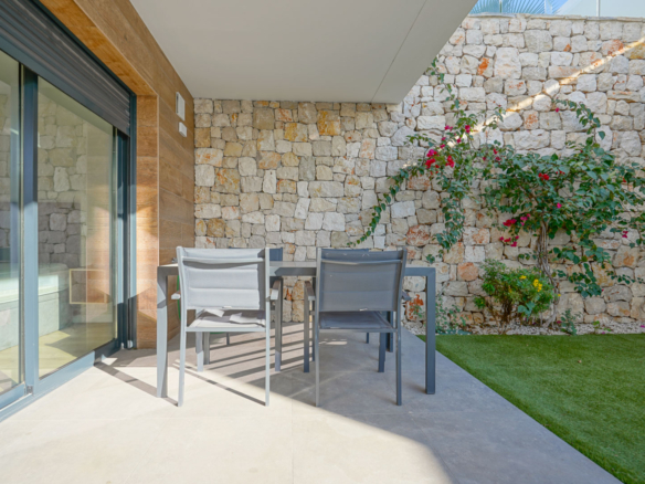 En outre, il y a une deuxième chambre double avec des armoires encastrées et une salle de bains séparée.Pour plus de confort, l’appartement dispose de deux armoires encastrées supplémentaires, une grande dans le salon et une plus petite à l’entrée.À l’extérieur, il y a une terrasse couverte spacieuse avec un salon et un coin salle à manger. Devant la terrasse se trouve un beau jardin avec des vues ouvertes sur la vaste réserve naturelle qui sépare Cumbre del Sol de Moraira. Grâce au mur en pierre naturelle du côté est, l’intimité est garantie ici.