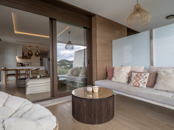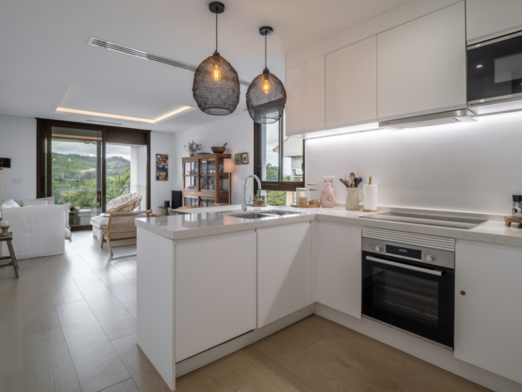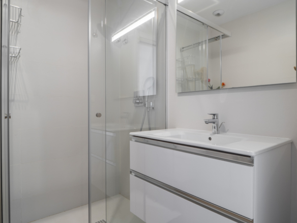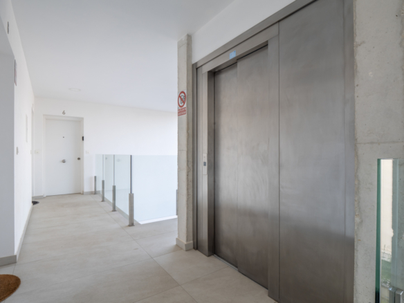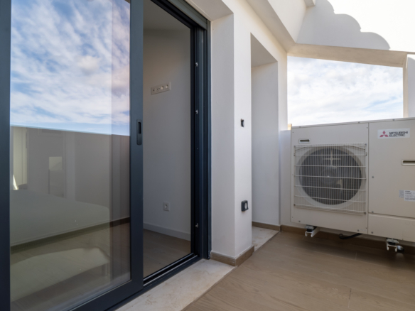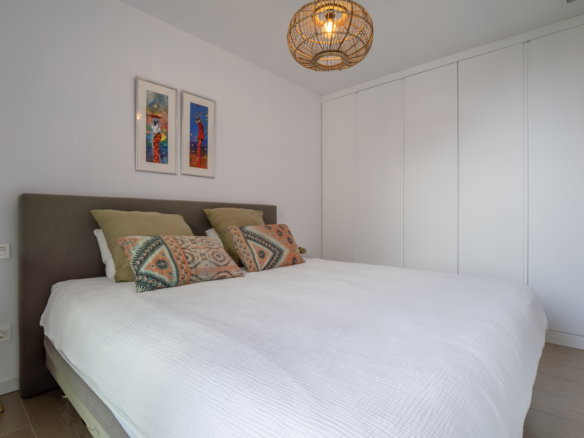 Le penthouse est réparti sur deux étages. Au rez-de-chaussée se trouvent un hall d’entrée, un salon-salle à manger spacieux et une cuisine moderne entièrement équipée avec réfrigérateur/congélateur, lave-vaisselle, four et micro-ondes. De grandes baies vitrées coulissantes donnent accès à une terrasse couverte depuis le salon. Cet étage comprend également une chambre double et une salle de bains.