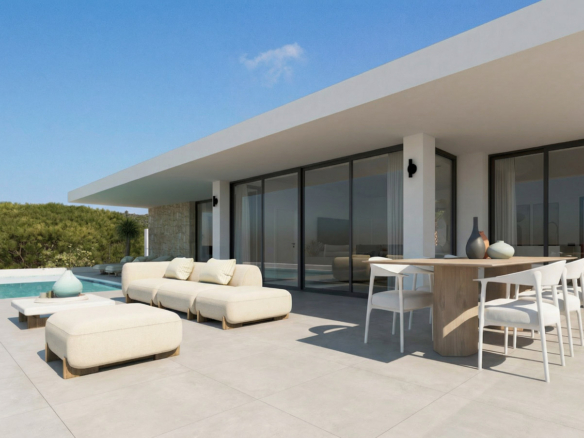 De larges ouvertures relient les espaces intérieurs à l’extérieur, où une piscine privée et une terrasse ensoleillée invitent à la détente. Un solarium en toiture offre un espace supplémentaire pour profiter des vues panoramiques et des couchers de soleil.