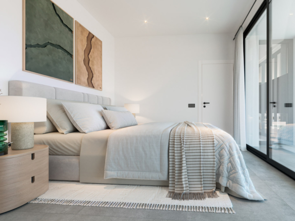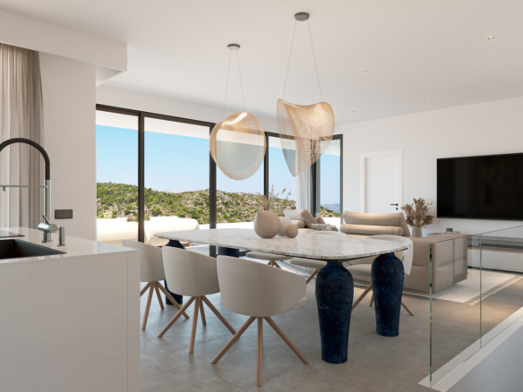 La villa dispose de trois chambres spacieuses et de trois salles de bains, ainsi qu’un bureau supplémentaire, idéal pour le télétravail ou comme espace polyvalent. L’espace de vie principal réunit salon, salle à manger et cuisine dans une configuration ouverte, maximisant la lumière naturelle et la connexion entre intérieur et extérieur.