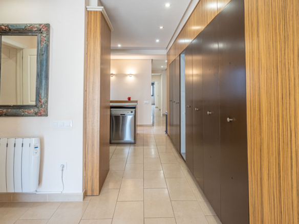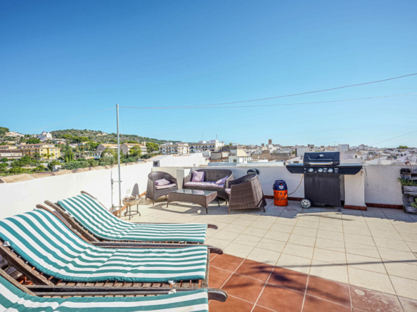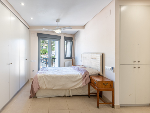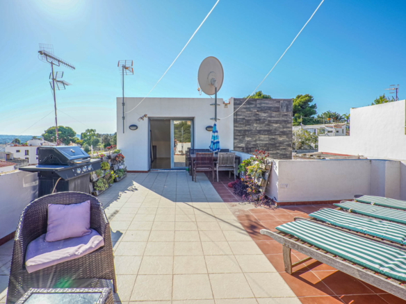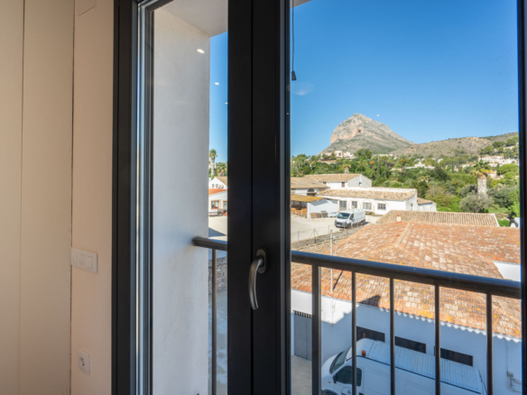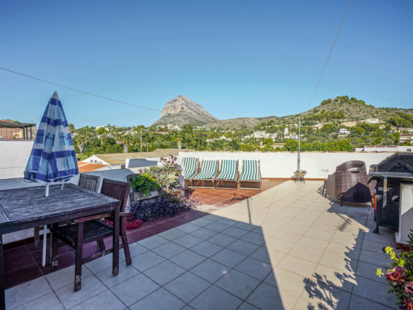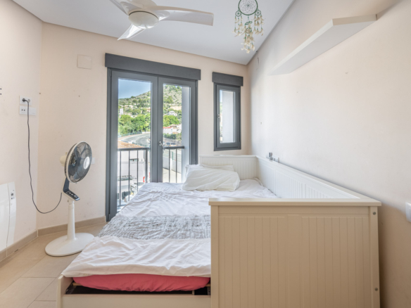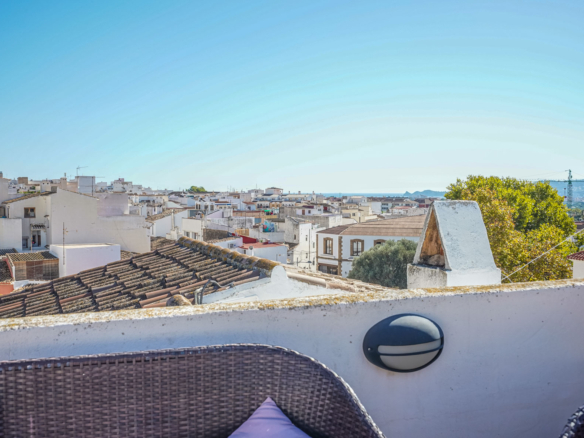 Dit rijtjeshuis is gelegen aan de rand van het historisch centrum van Jávea dat tot op vandaag haar middeleeuwse uitstraling heeft behouden. Hierdoor is het een uniek netwerk van smalle straatjes met zuiders ogende witte gevels en bloemdecoraties om door rond te kuieren. Je vindt er ook vele gezellige restaurantjes en leuke winkeltjes. Ook alle voorzieningen zoals supermarkten, medisch centrum, scholen, restaurants, etc. zijn te voet bereikbaar. De woning bestaat uit 4 verdiepen. De benedenverdieping is ingericht als commerciëel kantoor en heeft een aparte ingang. De eerste verdieping bestaat uit een grote woon-eetkamer met balkon, een keuken, twee tweepersoonsslaapkamers waarvan éen met en suite badkamer en een aparte badkamer. Ook is er een binnenterras om gezellig buiten te dineren. Op de tweede verdieping vinden we nogmaals dezelfde indeling. Hier is een tweede woon-eetkamer, een keuken, twee tweepersoonsslaapkamers waarvan éen met en suite badkamer en een aparte badkamer. De derde verdieping bestaat uit een grote kamer die als 5de slaapkamer, bureau, yoga studio, gym, etc. zou kunnen worden ingericht. Ook hier is een aparte badkamer met toilet en douche. Via de derde verdieping komen we op het ruime dakterras dat prachtig zicht biedt op de Montgó, het historisch centrum van Jávea en de zee. Vanuit alle slaapkamers is er tevens zicht op de Montgó. Bovendien hoef je nooit parkeerplaats te zoeken in het centrum want de woning heeft een enorme garage waar tot wel 4 wagens inpassen. De woning heeft een aparte elektriciteits- en watervoorziening voor elke verdieping, waardoor het mogelijk is om de ruimtes in 2 onafhankelijke appartementen te splitsen.