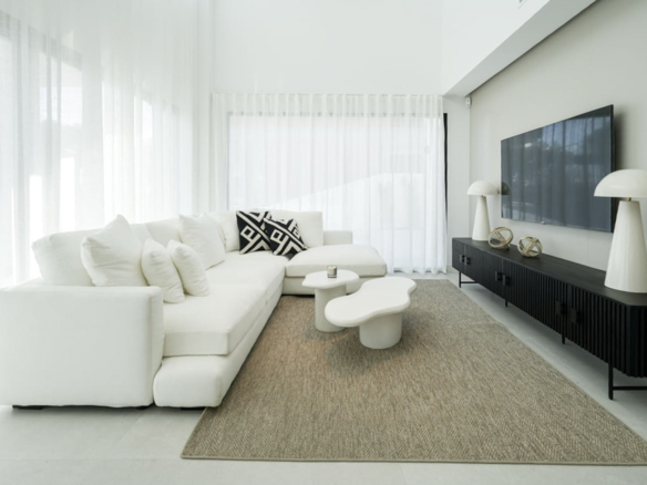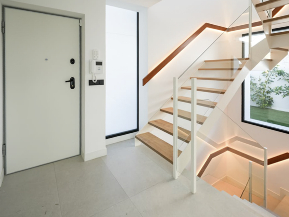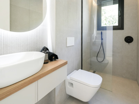 Dubbele beglazing met zonneregeling en gemotoriseerde rolluiken / Antislip tegels op terrassen en in garage / Badkamers met wandgemonteerd sanitair van het merk Roca, wastafels op houten werkblad, matzwarte kranen, handdoekradiatoren en douches bedekt met antislip porseleinen tegels / Airconditioning en vloerverwarming door het hele huis door middel van ARISTON aerothermisch systeem met warmtepomp en 150-liter opslagtank / Extralink Smartlife domoticasysteem met aanraakscherm om buitenverlichting, alarm en motoren te bedienen.