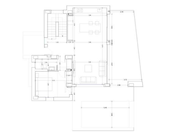De hoofdverdieping heeft een open keuken met eiland, uitgerust met Siemens apparatuur (inductiekookplaat, oven, magnetron, decoratieve afzuigkap, roestvrijstalen gootsteen, dubbele spoelbak en geïntegreerde koel-vriescombinatie) en een elegant porseleinen werkblad. De ruime woon-eetkamer staat in verbinding met een ruim overdekt terras met uitzicht op Polop, Altea en Callosa d’en Sarrià. Vanaf het terras kom je ook meteen bij het prachtige privé overloopzwenbad. Voor extra comfort is er op de benedenverdieping ook een slaapkamer en een complete badkamer.