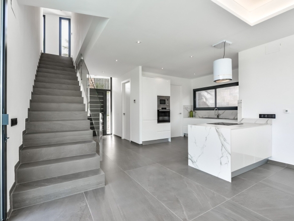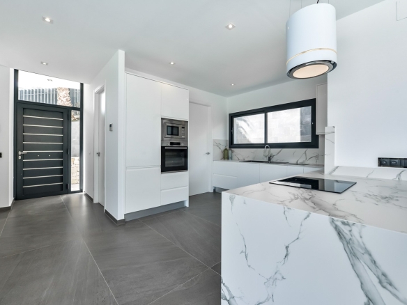 De keuken is volledig uitgerust met inbouwtoestellen, waaronder een keramische kookplaat, oven, microgolfoven, vaatwasser en kwalitatief hoogwaardig maatwerkmeubilair. De woning wordt verwarmd via een luchtwarmtepomp, ondersteund door zonne-energie, en beschikt over een centraal airconditioningsysteem dat de verschillende ruimtes efficiënt koelt en verwarmt.
