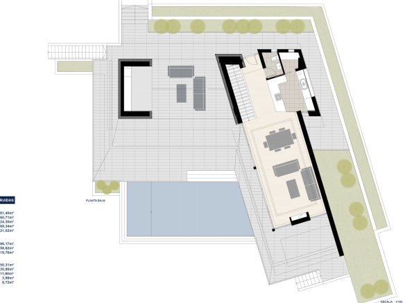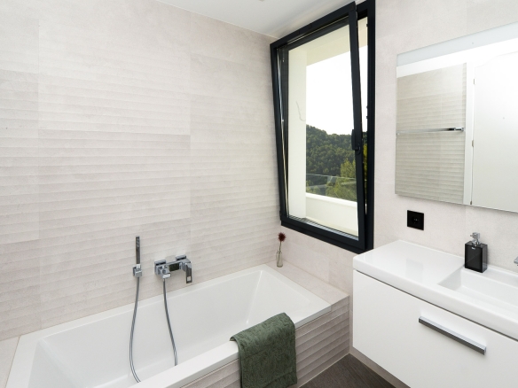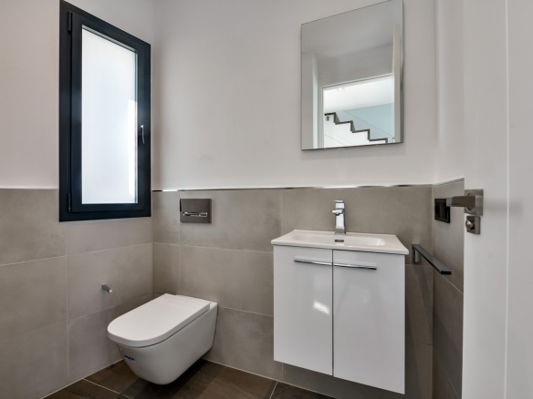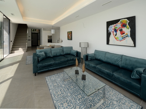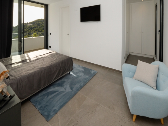 Het open zonneterras beschikt over een groot zwembad met infinity-effect, brede instaptrappen en onderwaterverlichting. Op de bovenverdieping bevinden zich drie ruime slaapkamers en twee badkamers, waarvan één en suite bij de master bedroom. Alle slaapkamers hebben directe toegang tot het grote dakterras.