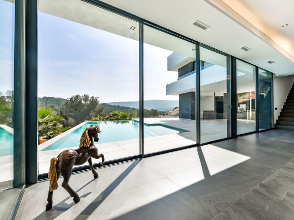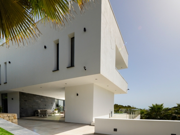 Deze stijlvolle moderne villa is gelegen op een uitstekende locatie in de gewilde urbanisatie Tosalet 5 in Jávea en geniet van een open uitzicht over de groene heuvels tot aan de zee. Op heldere dagen reikt het zicht zelfs tot Ibiza aan de horizon.