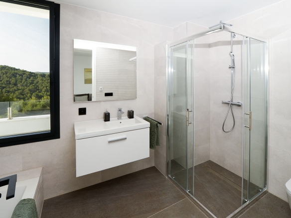 In de kelderverdieping bevindt zich een dubbele garage met automatische poort, evenals een ruime multifunctionele kelderruimte. De begane grond is ingedeeld met een royale woon- en eetruimte, een volledig uitgeruste keuken met aangrenzende bijkeuken en een gastentoilet. Aansluitend bevindt zich een groot overdekt terras met barbecuezone, een aangename schaduwrijke plek tijdens de zomermaanden, vanwaar u bovendien kunt genieten van prachtig zeezicht.