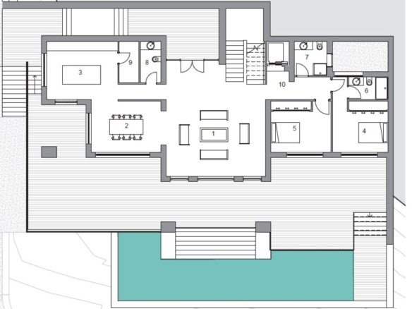 Deze zeer ruime villa is verdeeld over 3 verdiepingen. Op het algemene leefgedeelte bevinden zich de ruime salon met eethoek, een volledig ingerichte moderne keuken, een gastentoilet en 2 tweepersoon slaapkamer met badkamer en suite. Op de bovenste verdieping bevinden zich 2 ruime tweepersoons slaapkamers met badkamer en suite en de hoofdslaapkamer met kleedruimte en badkamer en suite. Op de onderste verdieping bevinden zich naast de garage een ruime berging, een wasruimte, een thuisbioscoop en een gym met Jacuzzi. Naast het ruime deels overdekte terras met zwembad zijn er diverse overige zitgedeelten rondom de woning vanwaar men van de prachtige uitzichten die deze villa te bieden heeft kan genieten.
