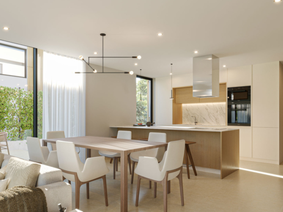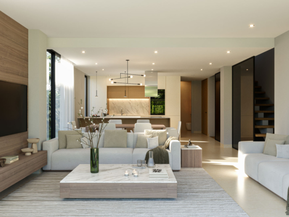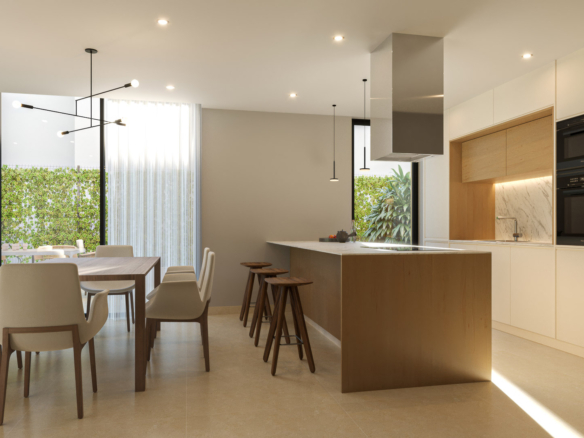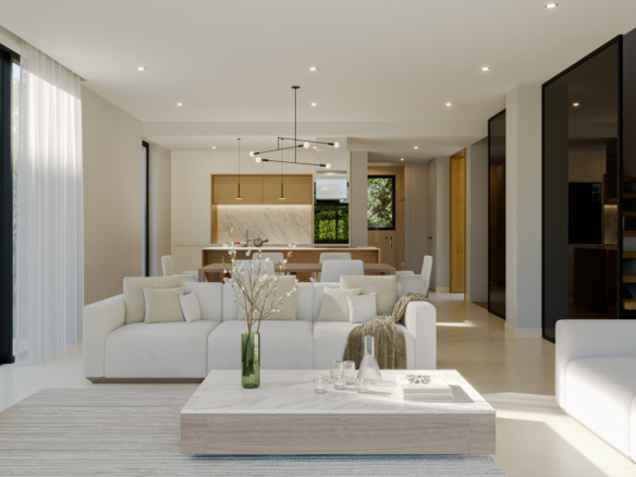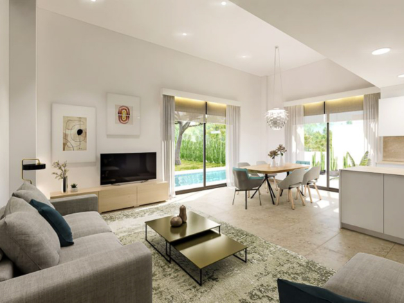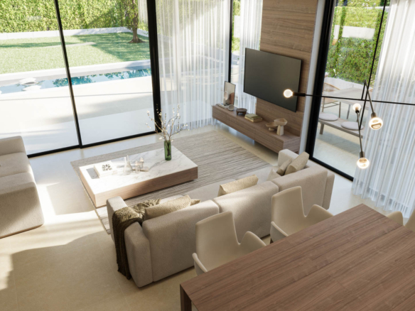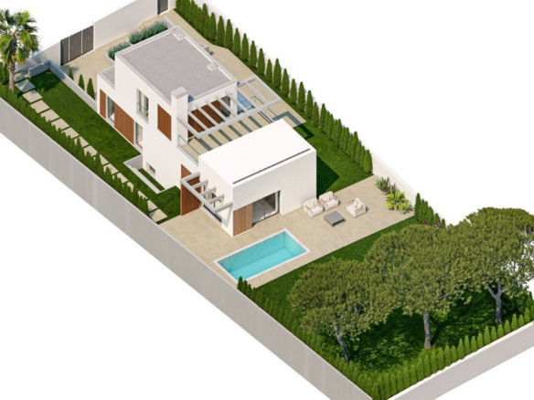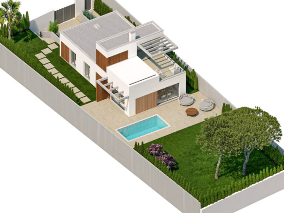 Deze villa valt op door zijn elegante indeling: een ruime woon-eetkamer met open keuken, drie tweepersoonsslaapkamers, waaronder een luxe master suite, plus een aparte badkamer en gastentoilet. Buiten kunnen bewoners genieten van hun eigen privézwembad, een verzorgde tuin en een dakterras dat ideaal is om ‘s avonds te ontspannen.