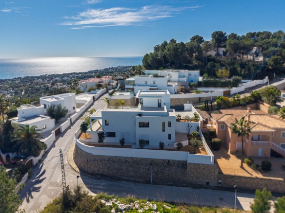 Deze nieuw gebouwde villa ligt in een rustige en exclusieve woonwijk en combineert luxe met eigentijds design en een perfecte zuidoriëntatie om optimaal te profiteren van het natuurlijke licht en het panoramische uitzicht. Vanuit de bevoorrechte positie biedt het pand een spectaculair 360 graden panoramisch uitzicht, dat zich uitstrekt van Jávea en Teulada tot de prachtige baai van Moraira.