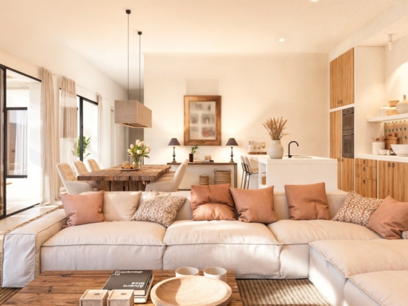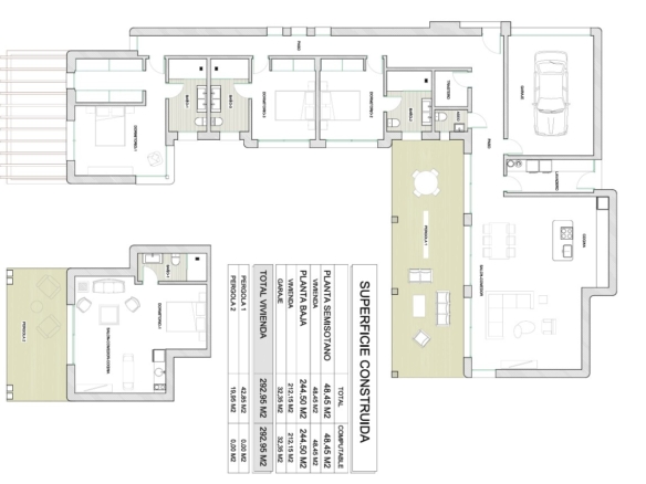 Deze villa is ontworpen met oog voor detail en biedt alles wat u zich kunt wensen. De begane grond beschikt over een ruime en lichte woon-eetkamer die naadloos overgaat in een moderne open keuken. Vanuit de leefruimtes leiden grote schuiframen naar een ruim terras met een stijlvolle pergola, ideaal om te genieten van het zonnige klimaat. Het terras ligt direct aan het privézwembad en is perfect georiënteerd op het zuiden, zodat u de hele dag van de zon kunt genieten. Op deze verdieping bevinden zich tevens drie ruime tweepersoonsslaapkamers, elk met een en suite badkamer, en een gastentoilet. Voor extra gemak is er ook een garage die direct verbonden is met de woning.