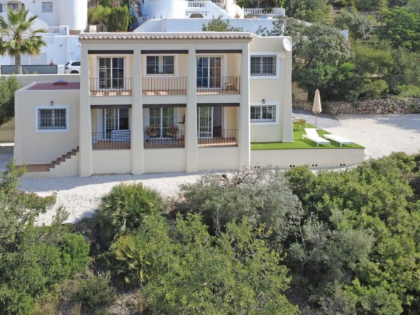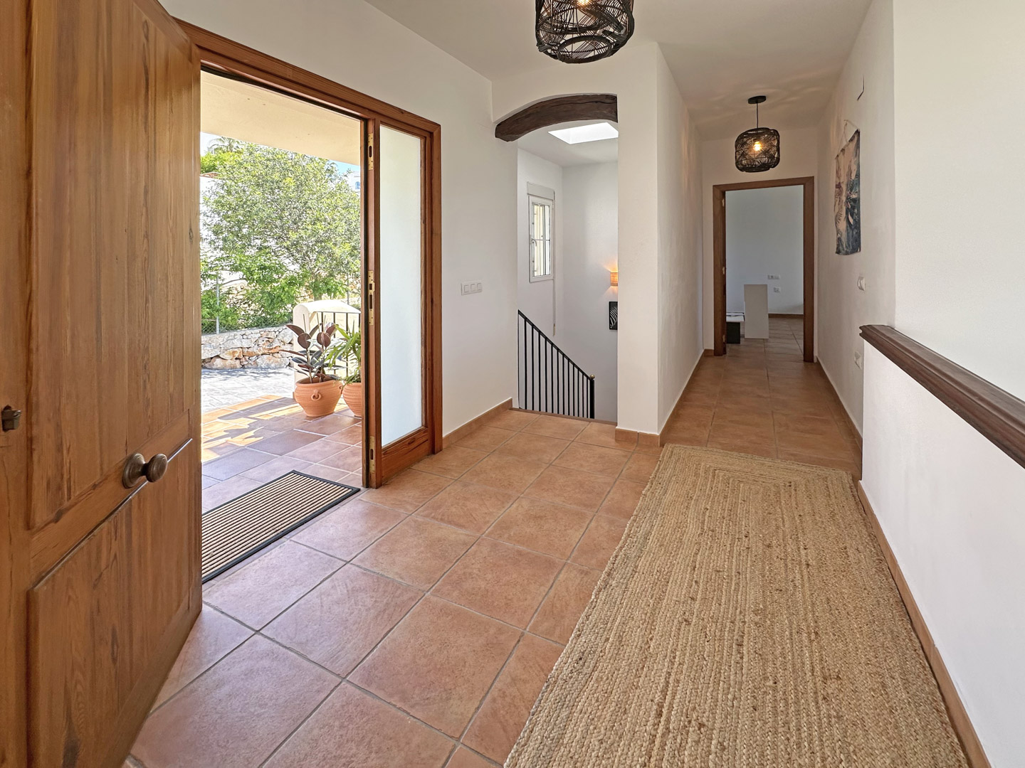 De villa is gelegen op een grondstuk van wel liefst 2417 m2 en verdeeld over twee verdiepen. Een automatische poort geeft toegang tot een ruime oprit met meerdere parkeerplaatsen zowel aan de benedenverdieping als aan de bovenverdieping. Enkele treden geven toegang tot de voordeur waar je binnenkomt in een hal op de bovenverdieping. Links bevindt zich de hoofdslaapkamer met een dressing en een en suite badkamer. Rechts bevindt zich een tweede slaapkamer met inbouwkasten en een en suite badkamer. Beide slaapkamers geven toegang tot een ruim balkon dat uitzicht biedt over het prachtige landschap.