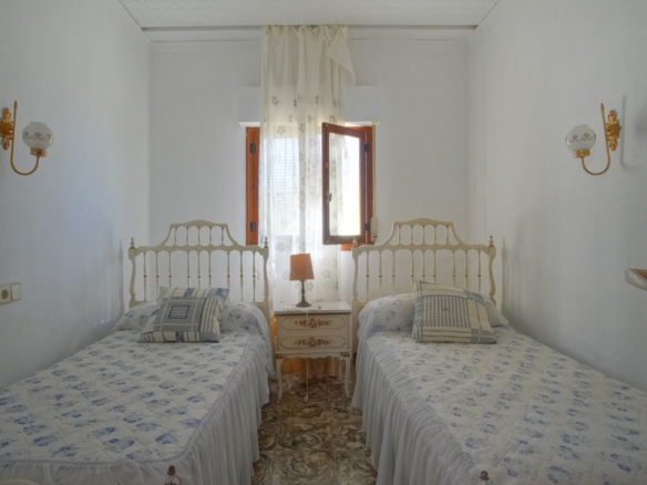 De benedenverdieping bestaat uit een ruim overdekt terras, een salon, een keuken, drie slaapkamers, een badkamer en een extra kamer die als opslag of vierde slaapkamer kan benut worden. De bovenverdieping bestaat uit een ruim salon met toegang tot een groot terras van waar u de zee kunt zien. Deze verdieping bestaat verder uit een keuken, drie slaapkamers en een badkamer. De villa beschikt ook over een ruim dakterras met een 360 graden uitzicht op de Montgó, Cabo de San Antonio en de zee. Er is ook een garage met parkeerruimte voor één wagen, een buitenbadkamer, een oprit met parkeerruimte en een vlak stuk tuin.