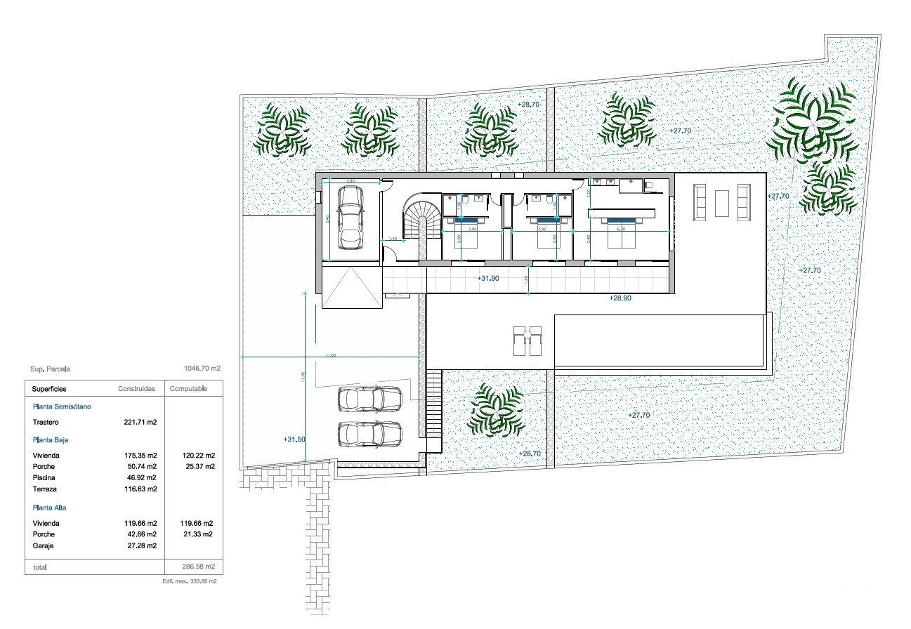 De begane grond (175,35m2) bestaat uit een ruime lichtovergoten woonkamer met een open keuken met kookeiland, een gastentoilet en een slaapkamer met badkamer en suite. Buiten vinden we het schitterende overloopzwembad, omringd door een groot terras en de barbecueplaats. De bovenverdieping (119,66 m2) bestaat uit drie ruime slaapkamers, elk met een eigen en-suite badkamer, die privacy en comfort bieden en een balkon om van het prachtige uitzicht te genieten. Aan de buitenkant van deze verdieping bevindt zich de garage met parkeerruimte voor twee wagens. De kelderverdieping bestaat uit een opslagruimte van 221 m2.