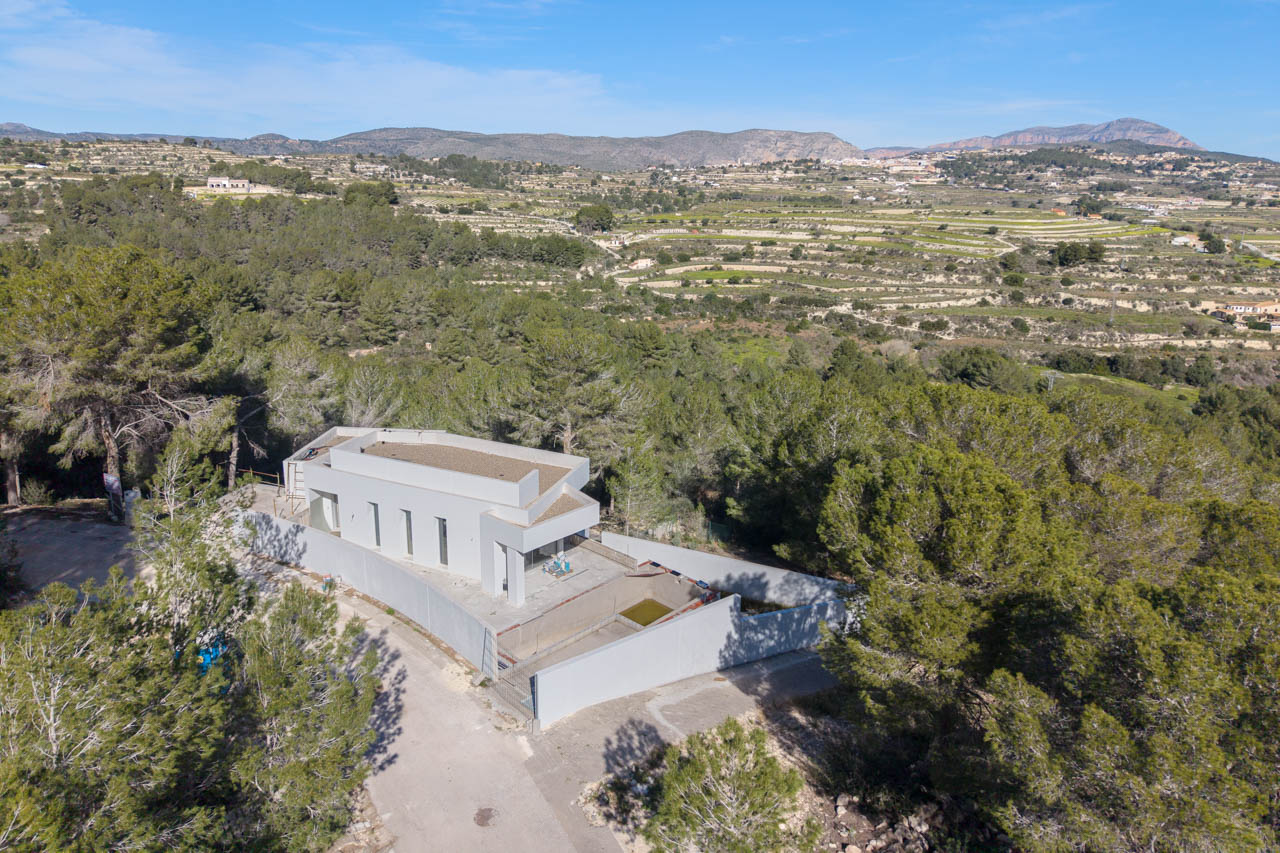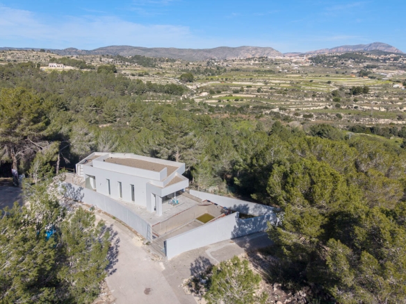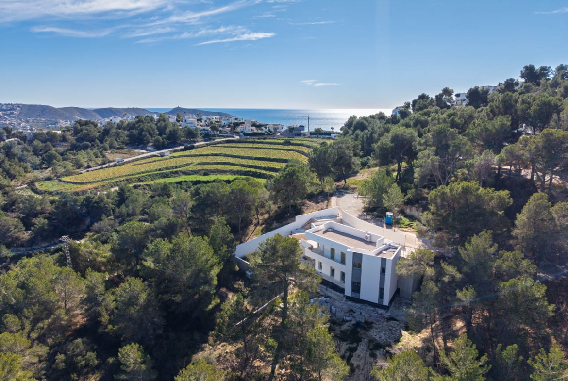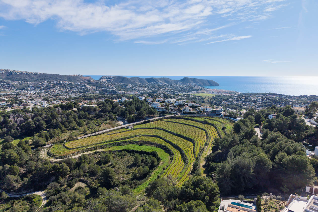 Deze moderne villa ligt in een rustige groene omgeving met open uitzicht op de bergen en wijngaarden van Moraira en is een architectonisch juweeltje.