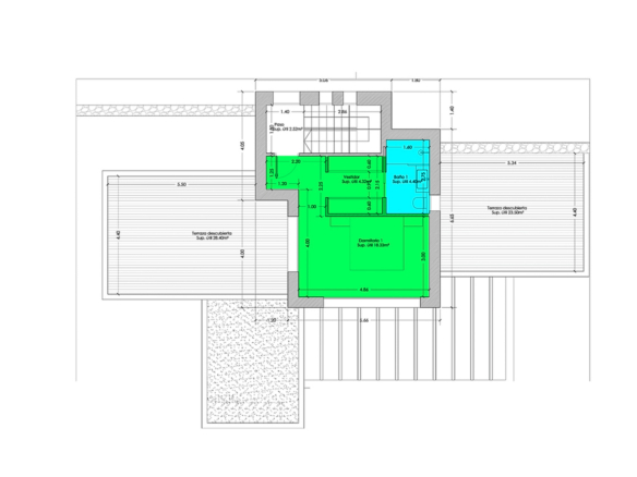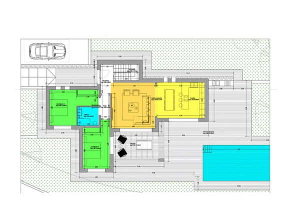 Op de begane grond heeft de villa een ruime en lichte woon-eetkamer, ideaal om te genieten van momenten met familie of vrienden, met directe toegang tot een indrukwekkend terras van 87 m² en een zwembad van 32 m². De volledig uitgeruste en ingerichte keuken staat ook in verbinding met buiten, zodat je van het uitzicht kunt genieten terwijl je buiten kookt of een maaltijd deelt. Op dezelfde verdieping zijn twee ruime tweepersoonsslaapkamers, beide uitgerust met inbouwkasten, die ook toegang hebben tot het terras en het zwembad. Een moderne badkamer met douche completeert de benedenverdieping.